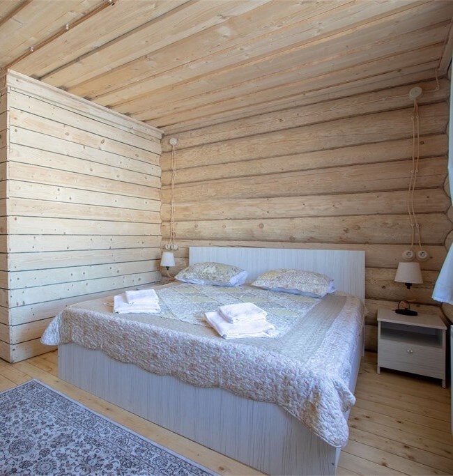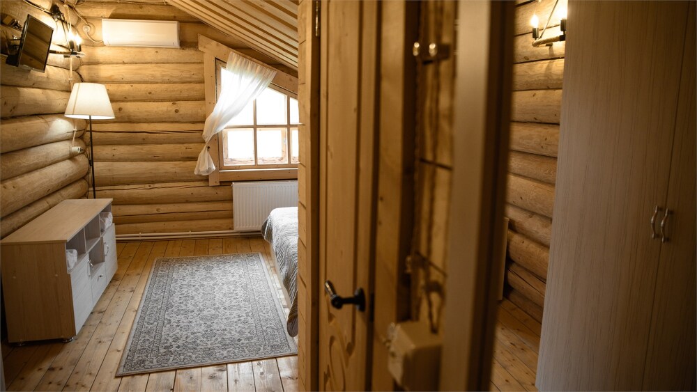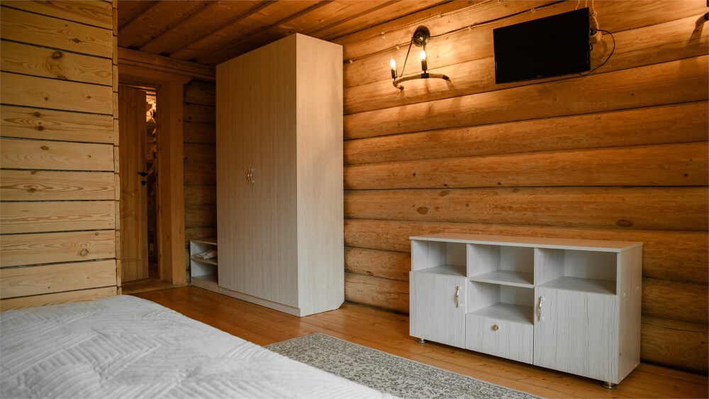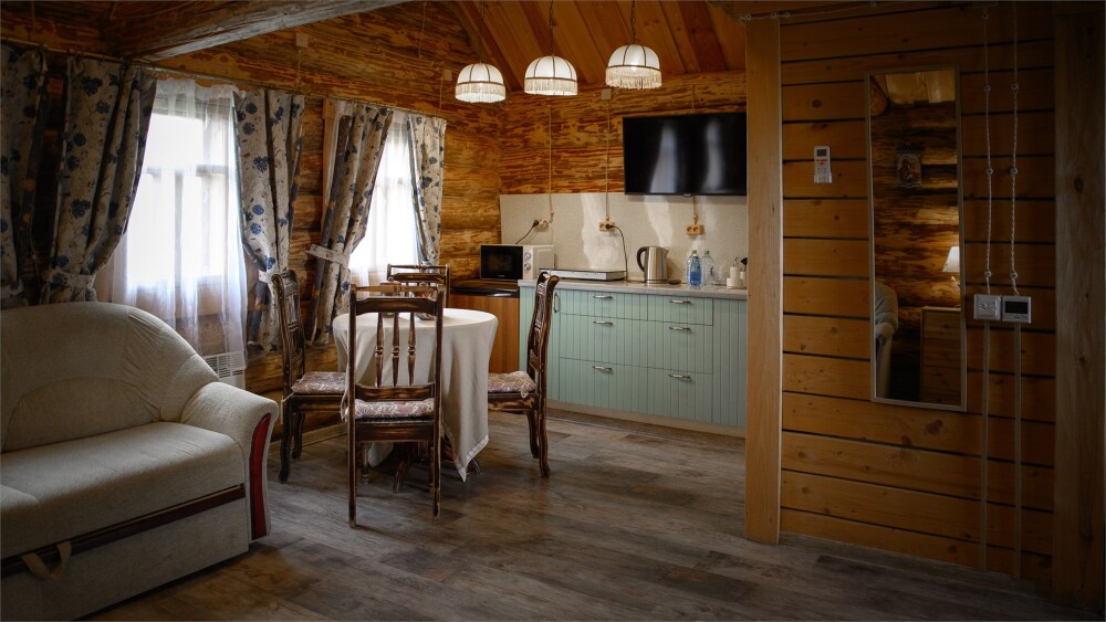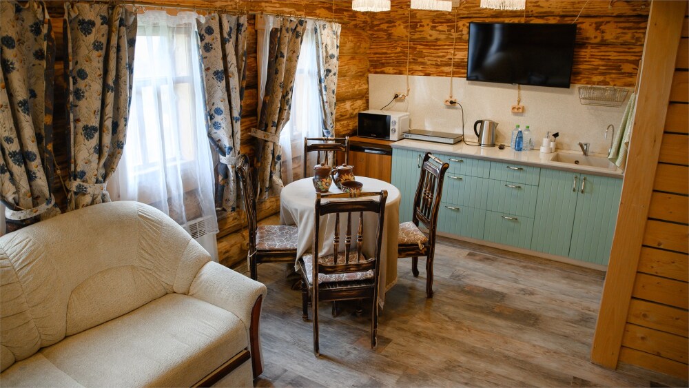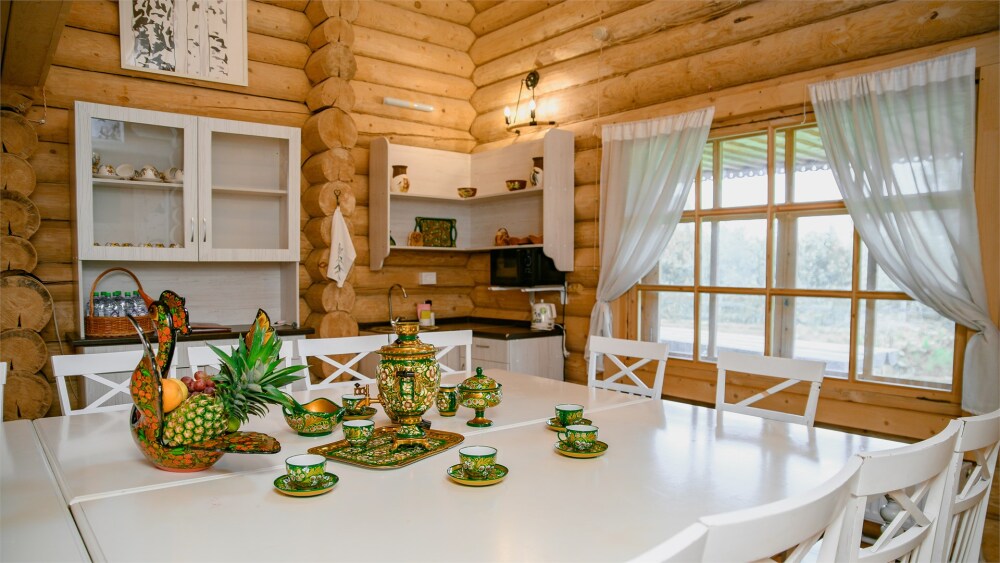 Хоромы Крестьянской Усадьбы располагают восемью спальнями, гостиной с сейфом, большим кондиционером и буфетом, холодильником, микроволновой печью, TV и обеденным столом, а также мангальной зоной и верандой с видом на небольшой пруд.