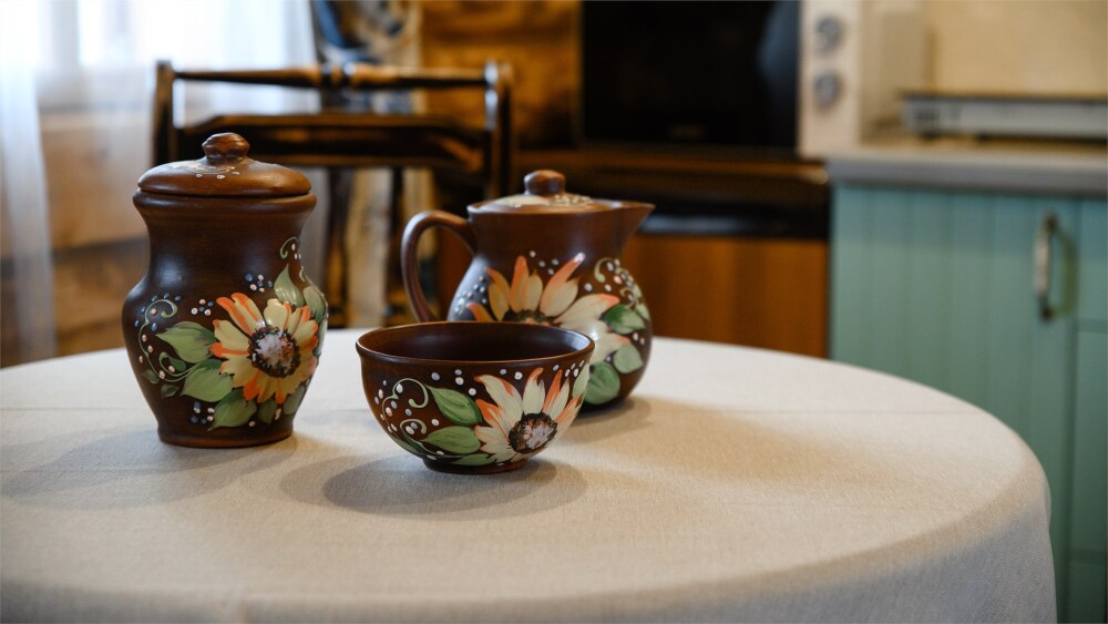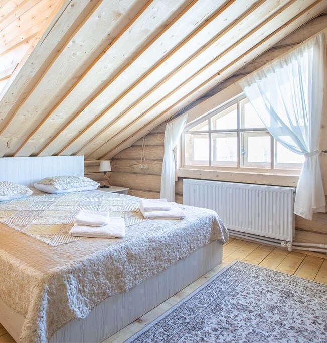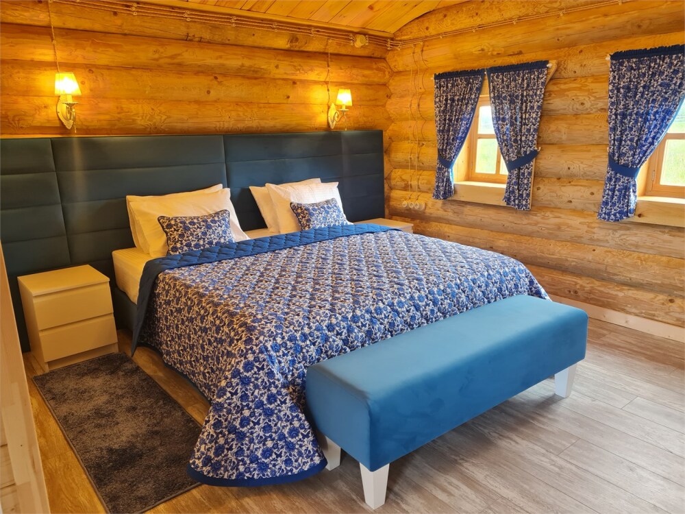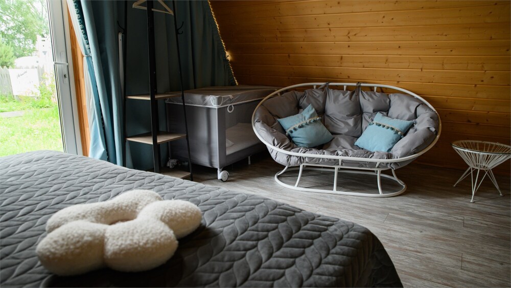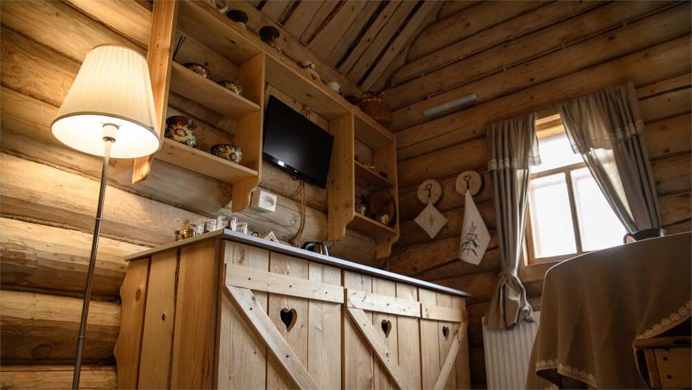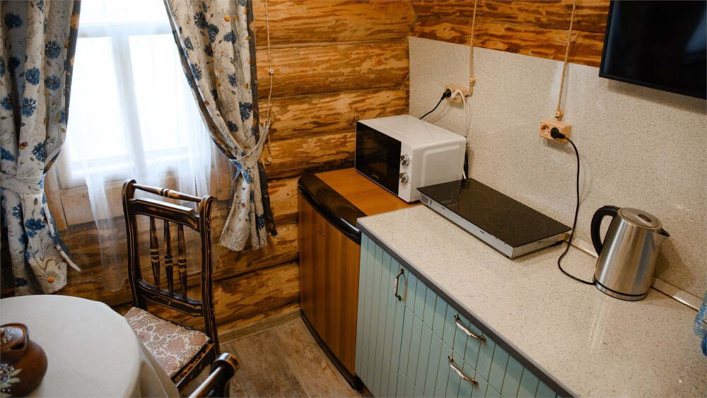 Хоромы Крестьянской Усадьбы располагают восемью спальнями, гостиной с сейфом, большим кондиционером и буфетом, холодильником, микроволновой печью, TV и обеденным столом, а также мангальной зоной и верандой с видом на небольшой пруд.