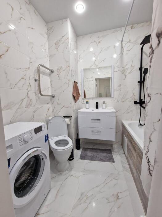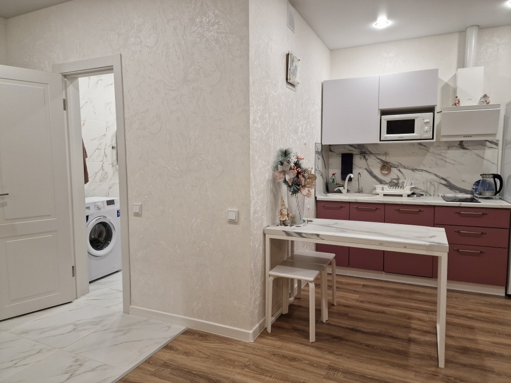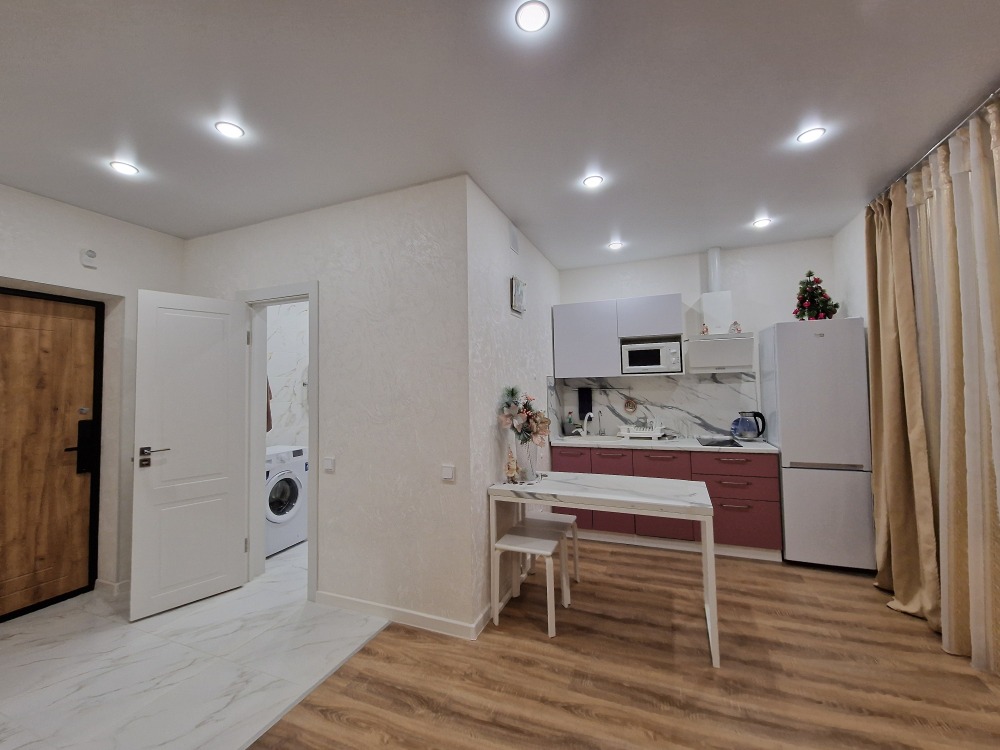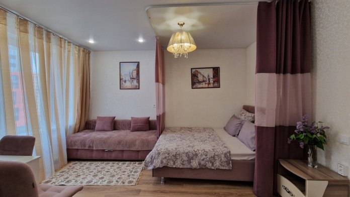 В студии имеется все для комфортного проживания 4-х человек: большая двуспальная кровать, зонированная шторой, раскладной диван еврокнижка, письменный стол, кондиционер, плита, посудомоечная машина, холодильник, микроволновка, посуда, ТВ, бесплатный вай-фай, стиральная машина, утюг, сушилка, постельное белье, полотенца, халаты, предметы личной гигиены, гардеробная, балкон. Вся мебель и техника новые.