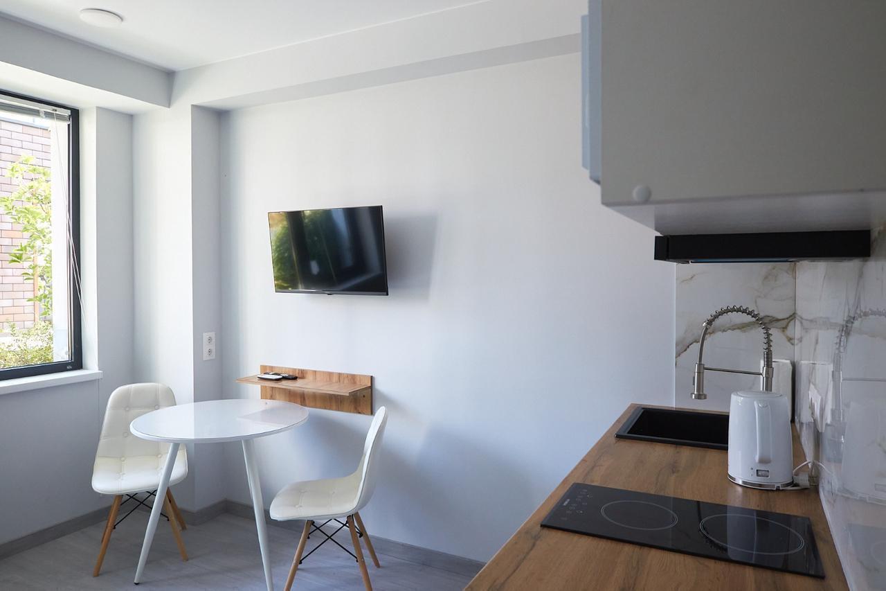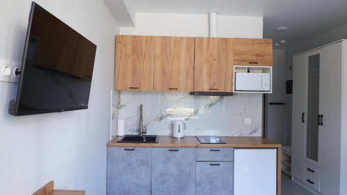 В студии вся необходимая мебель, 2-местное спальное место с ортопедическим основанием. Белоснежная постель. Кухонный гарнитур с бытовой техникой, холодильник, варочная панель, вытяжка, чайник, микроволновка, посуда, телевизор, стиральная машина, душ. Обеденная зона, шкаф для одежды, кондиционер, скоростной вай фай. Окно студии выходит на благоустроенную террасу, где можно проводить время с видом на море.