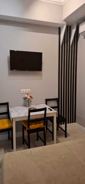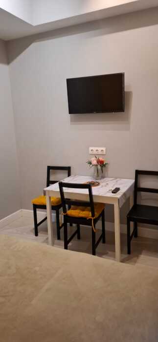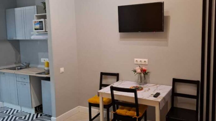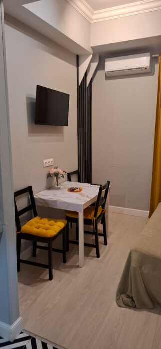 - Комнаты: одна комната-студия с удобной кроватью и рабочей зоной, включающей стол и стулья.