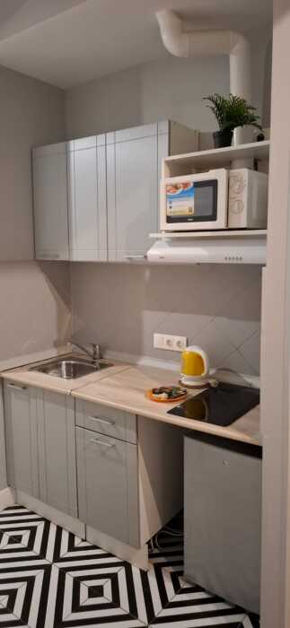- Кухня: современная кухня, оснащенная всей необходимой техникой, включая холодильник, микроволновую печь, электрическую плиту и вытяжку.
