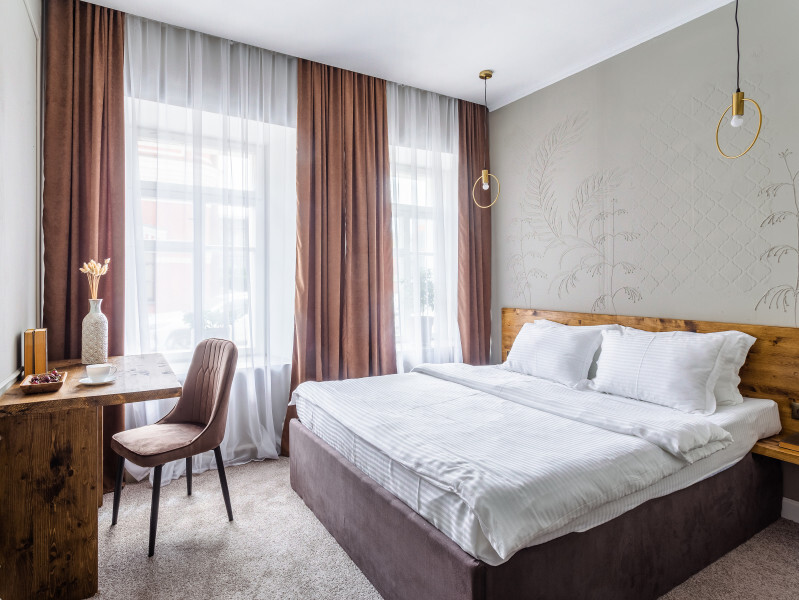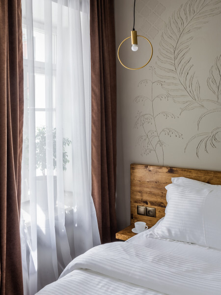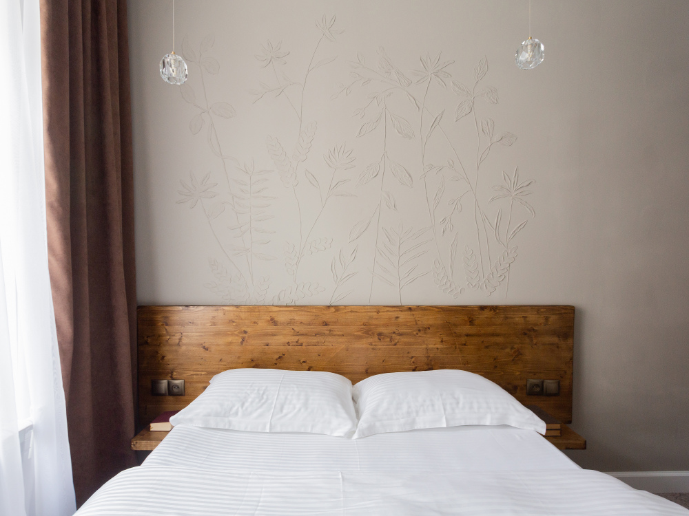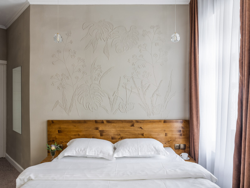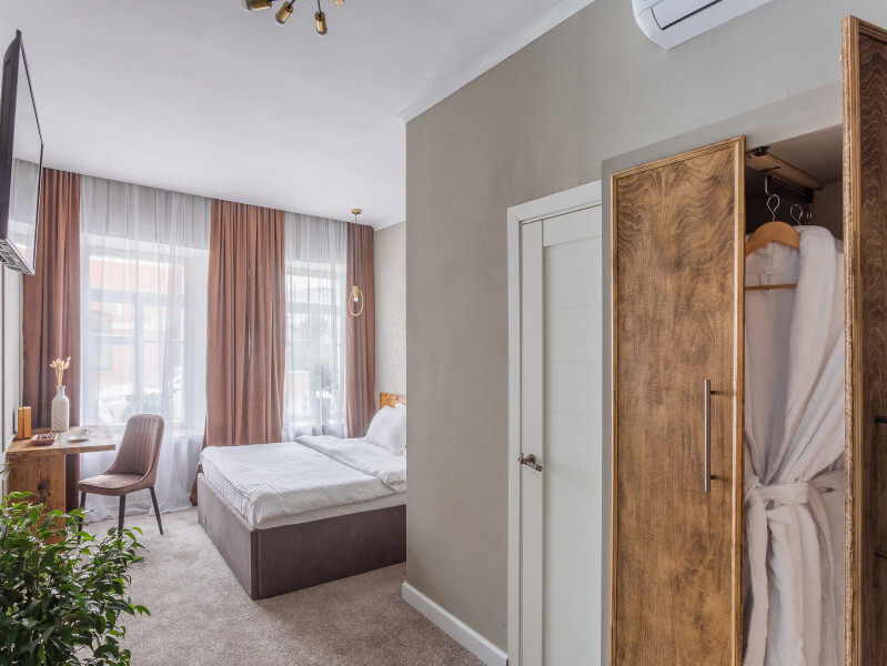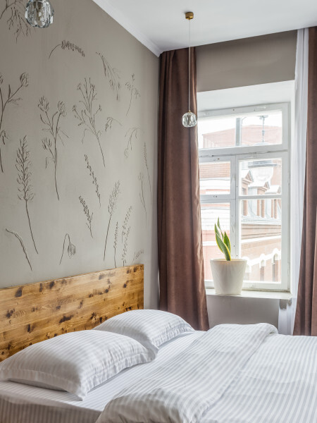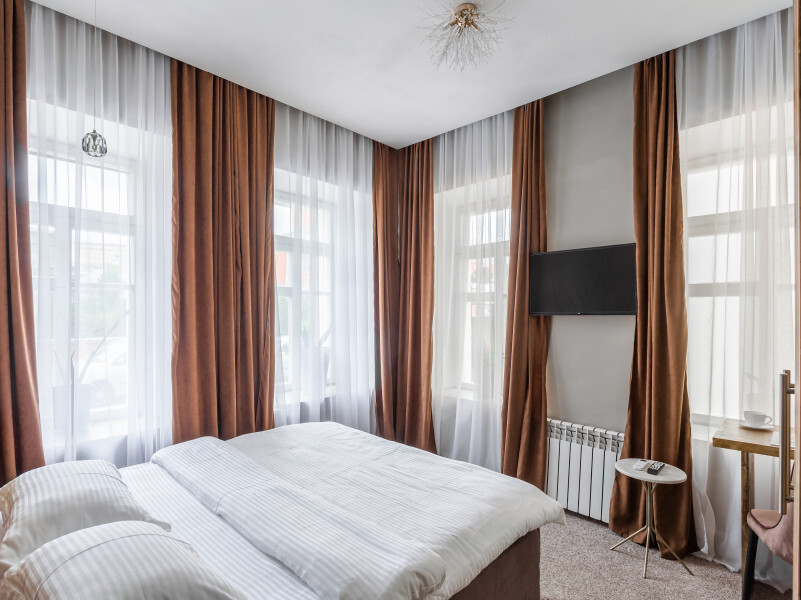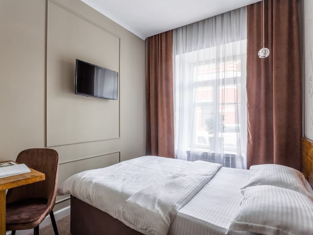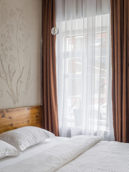 Двухместный нoмеp СТАНДАРТ площадью 15 м2 с большим окном (вид во двор!), высокими потолками и собственной ванной комнатой. В номере есть все необходимое для комфортного пребывания: - большая двуспальная кровать с натуральным постельным бельем из лиоцеллы, - рабочая зона, - шумоизоляция, - большое зеркало. В ванной комнате душ, туалет, раковина, зеркало, фен, а также полотенца, тапочки и средства личной гигиены (гель, шампунь, зубные наборы (по запросу), жидкое мыло, туалетная бумага). Все номера также оснащены кондиционером, телевизором и бесплатным скоростным Wi-Fi.