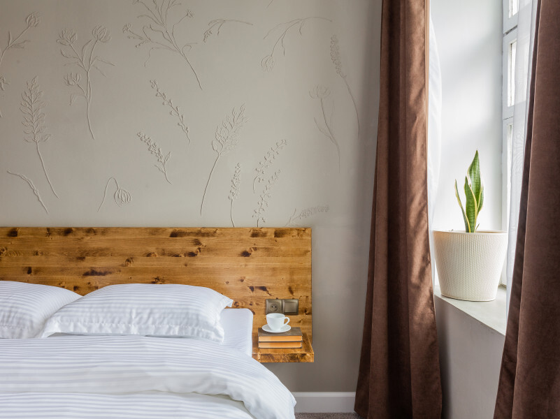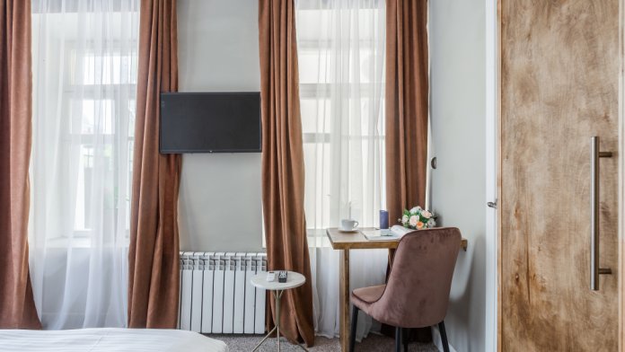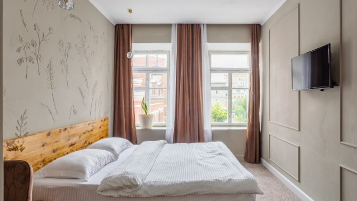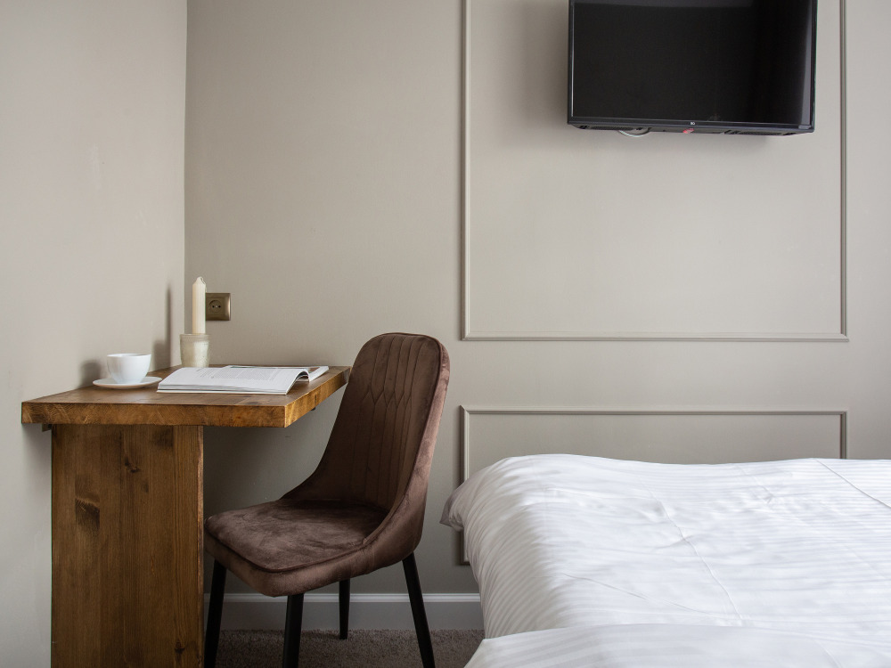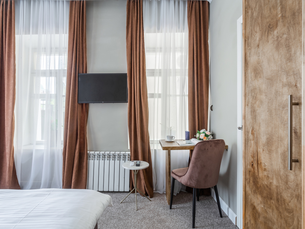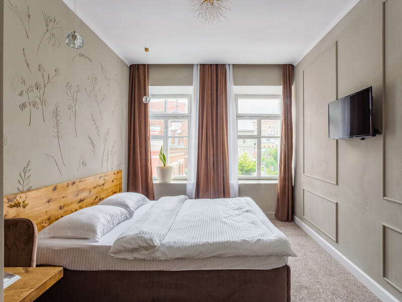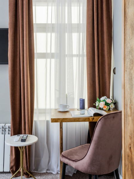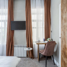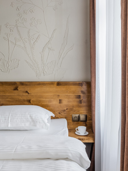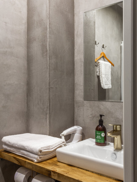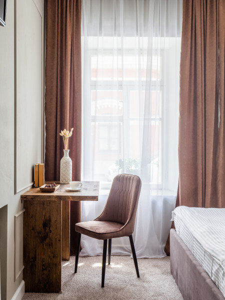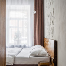 Двухместный нoмеp СТАНДАРТ площадью 15 м2 с большим окном (вид во двор!), высокими потолками и собственной ванной комнатой. В номере есть все необходимое для комфортного пребывания: - большая двуспальная кровать с натуральным постельным бельем из лиоцеллы, - рабочая зона, - шумоизоляция, - большое зеркало. В ванной комнате душ, туалет, раковина, зеркало, фен, а также полотенца, тапочки и средства личной гигиены (гель, шампунь, зубные наборы (по запросу), жидкое мыло, туалетная бумага). Все номера также оснащены кондиционером, телевизором и бесплатным скоростным Wi-Fi.