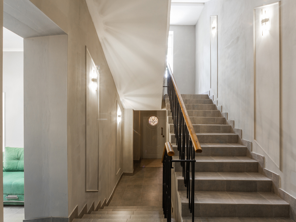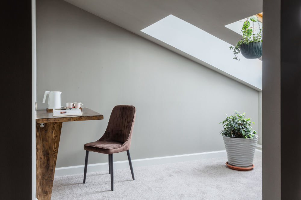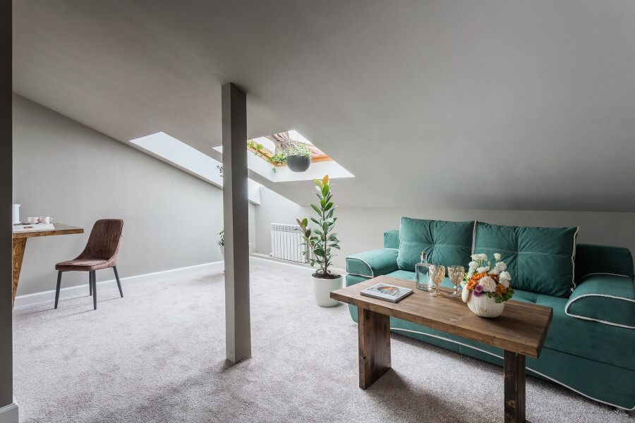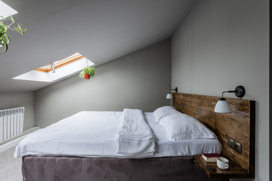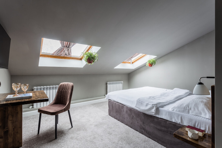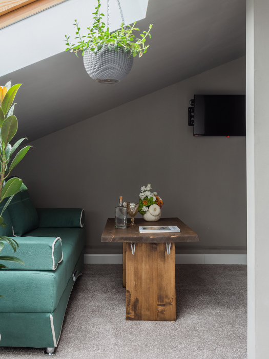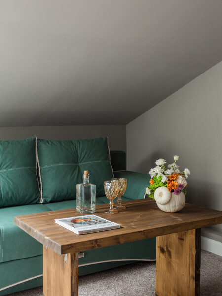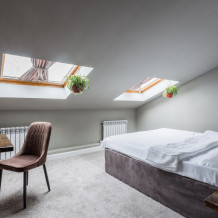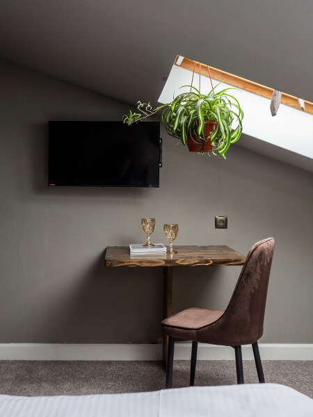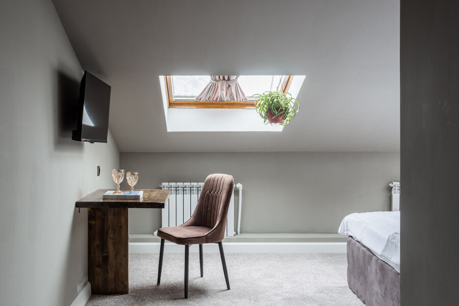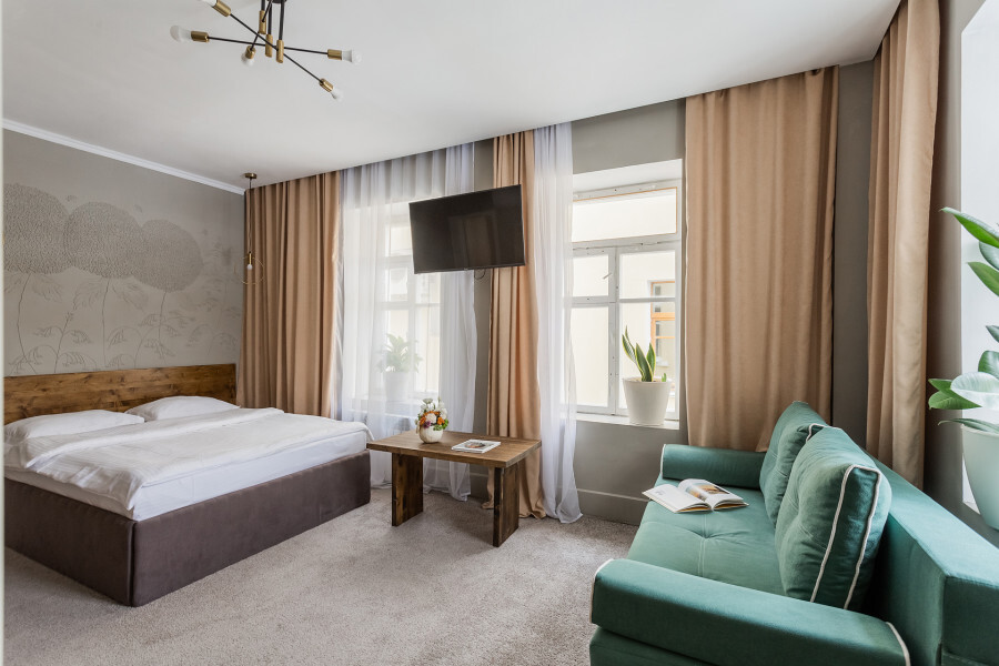 Нoмеp ДЕЛЮКС четырехместный на мансарде площадью 25 м2 с видом на достопримечательность. В номере есть все необходимое: большая двуспальная кровать с натуральным постельным бельем из лиоцеллы, двуспальный диван, рабочая зона, шумоизоляция, зеркало, шторы блэкаут, шкаф для одежды, индивидуальный комплект махрового халата (по запросу), полотенец и тапочек. В ванной комнате душ, туалет, зеркало, фен и средства личной гигиены (гель, шампунь, зубные наборы (по запросу), жидкое мыло, туалетная бумага). Все номера также оснащены кондиционером, телевизором и бесплатным скоростным Wi-Fi.