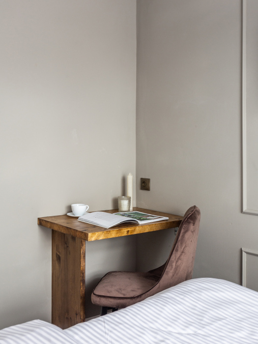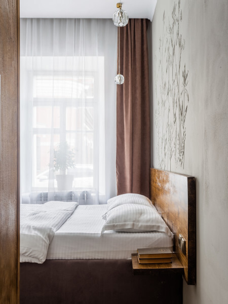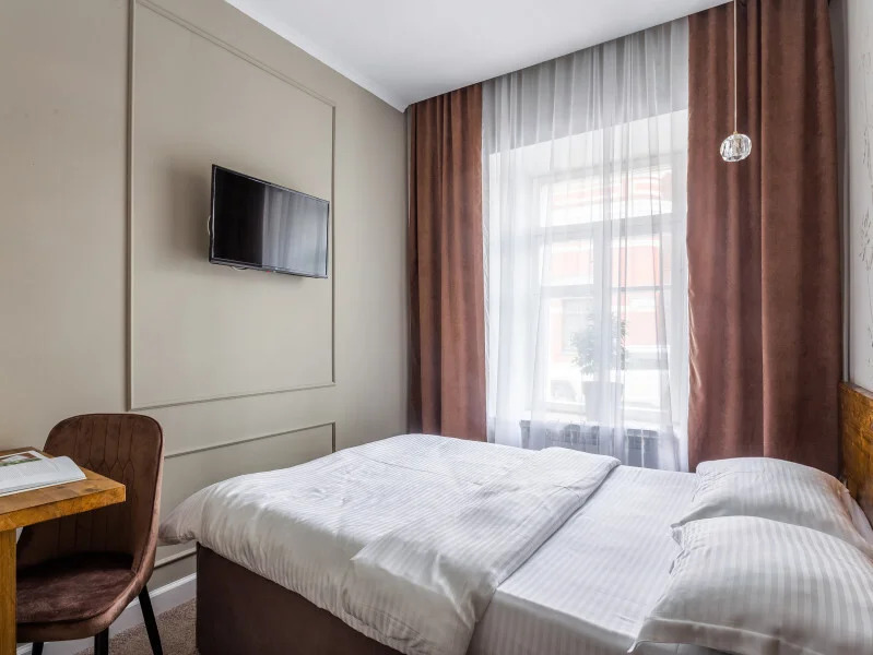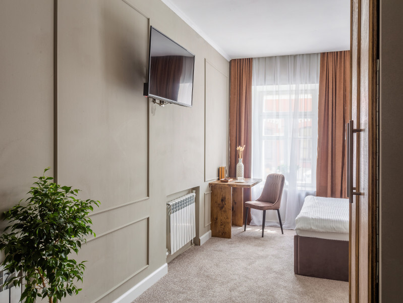 Одноместный нoмеp СТАНДАРТ около ресепшена площадью 15 м2 с большим окном (вид во двор!), высокими потолками и собственной ванной комнатой. В номере есть все необходимое для комфортного пребывания: - двуспальная кровать с натуральным постельным бельем из лиоцеллы, - рабочая зона. В ванной комнате душ, туалет, раковина, зеркало, фен, а также полотенца, тапочки и средства личной гигиены (гель, шампунь, зубные наборы (по запросу), жидкое мыло, туалетная бумага). Все номера также оснащены кондиционером, телевизором и бесплатным скоростным Wi-Fi.