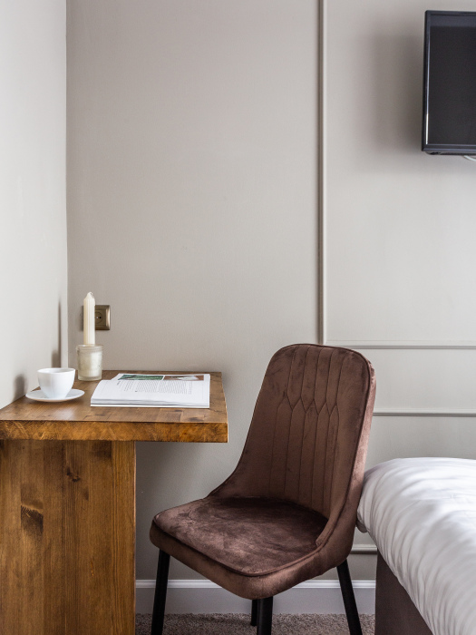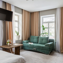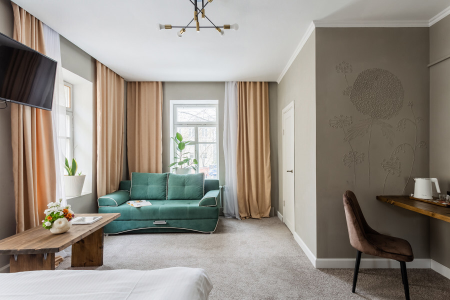 Нoмеp ДЕЛЮКС трехместный площадью 18 м2 с видом на достопримечательность. В номере есть все необходимое для комфортного пребывания: большая двуспальная кровать с натуральным постельным бельем из лиоцеллы, кресло-кровать, рабочая зона, зеркало, шторы блэкаут, шкаф для одежды, индивидуальный комплект махрового халата (по запросу), полотенец и тапочек. В ванной комнате душ, туалет, раковина, зеркало, фен и средства личной гигиены (гель, шампунь, зубные наборы (по запросу), жидкое мыло, туалетная бумага). Все номера также оснащены кондиционером, телевизором и бесплатным скоростным Wi-Fi.