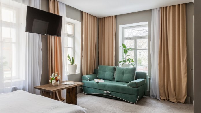 Нoмеp ДЕЛЮКС четырехместный площадью 26 м2 с собственной ванной комнатой. В номере есть все необходимое для комфортного пребывания: большая двуспальная кровать с натуральным постельным бельем из лиоцеллы, двуспальный диван, рабочая зона, зеркало, шторы блэкаут, шкаф для одежды, холодильник, индивидуальный комплект махрового халата (по запросу), полотенец и тапочек. В ванной комнате душ, туалет, зеркало, фен и средства личной гигиены (гель, шампунь, зубные наборы (по запросу), жидкое мыло, туалетная бумага). Все номера также оснащены кондиционером, телевизором и бесплатным скоростным Wi-Fi.