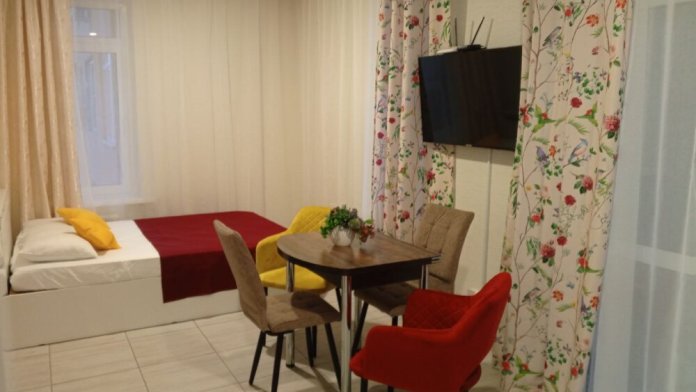 Просторная светлая студия оборудована всем необходимым для отдыха - двуспальная кровать, односпальный диван и двуспальный диван плюс раскладушка, в ванной есть стиральная машина, фен, гладильные принадлежности, кухня оборудована варочной панелью, большим холодильником, микроволновкой и чайником.