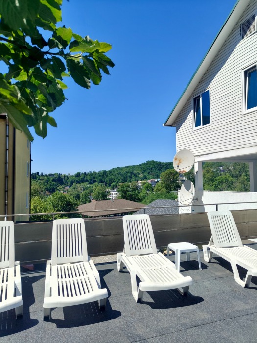 На территории гостевого дома имеется терраса с шезлонгами для загара, детская площадка, открытый бассейн, бесплатная парковка. На всей территории имеется бесплатный доступ в интернет (Wi-Fi).