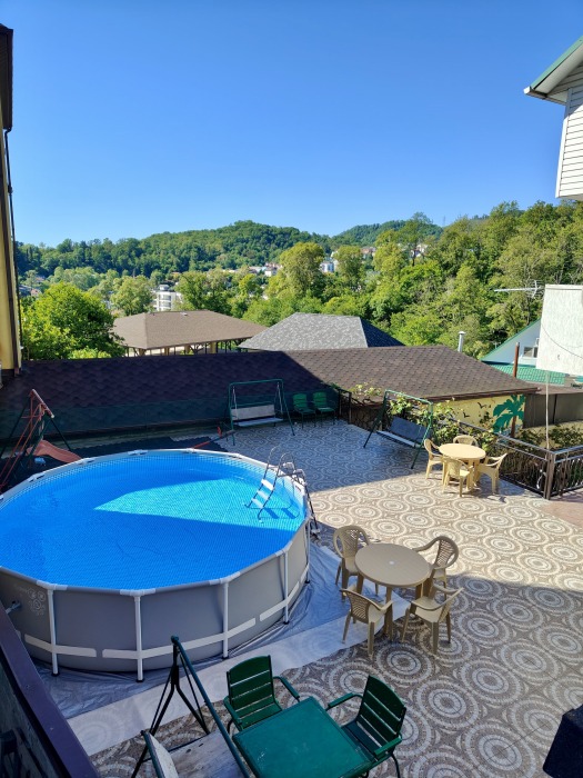 Номер находится на одной террасе с бассейном и детской площадкой