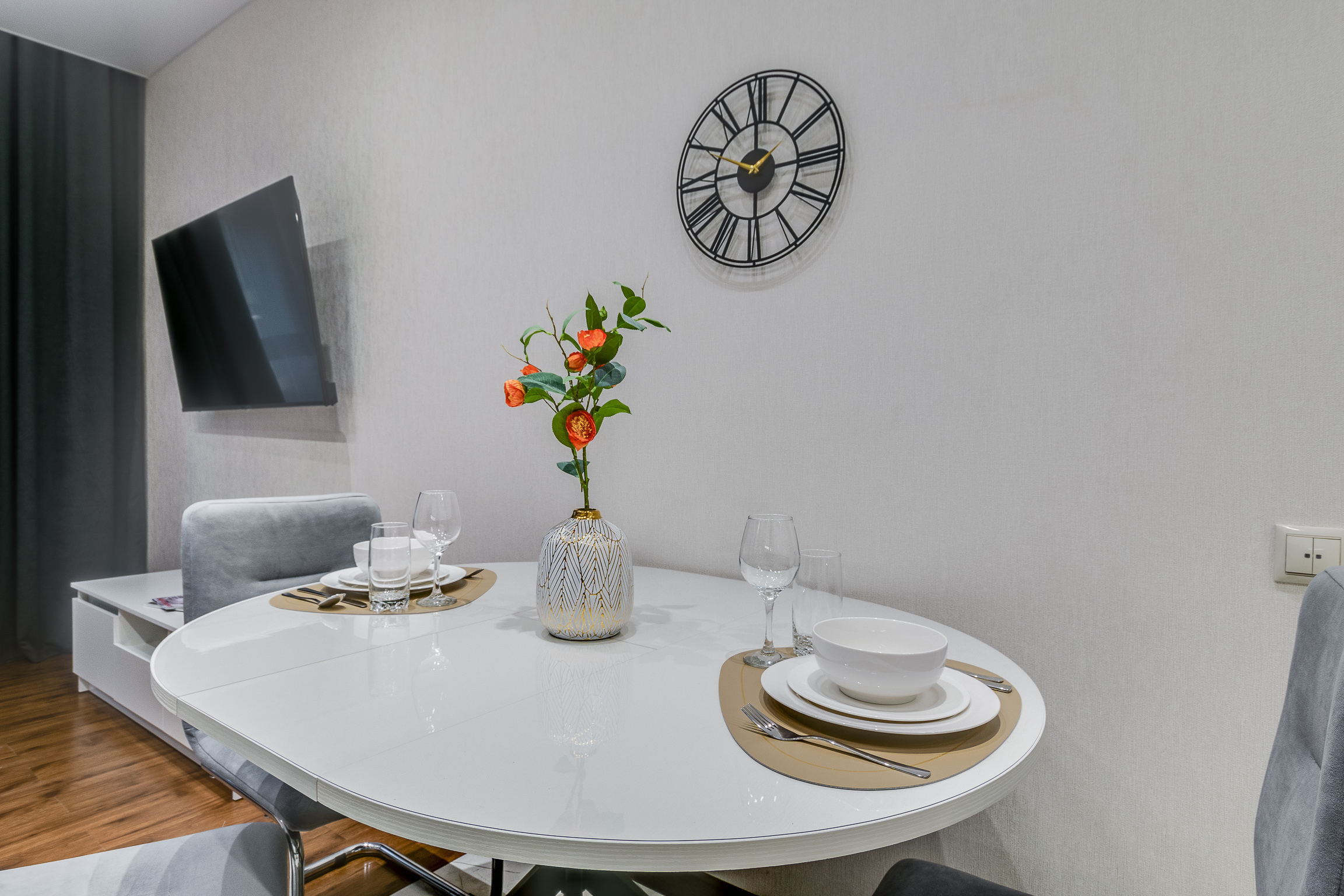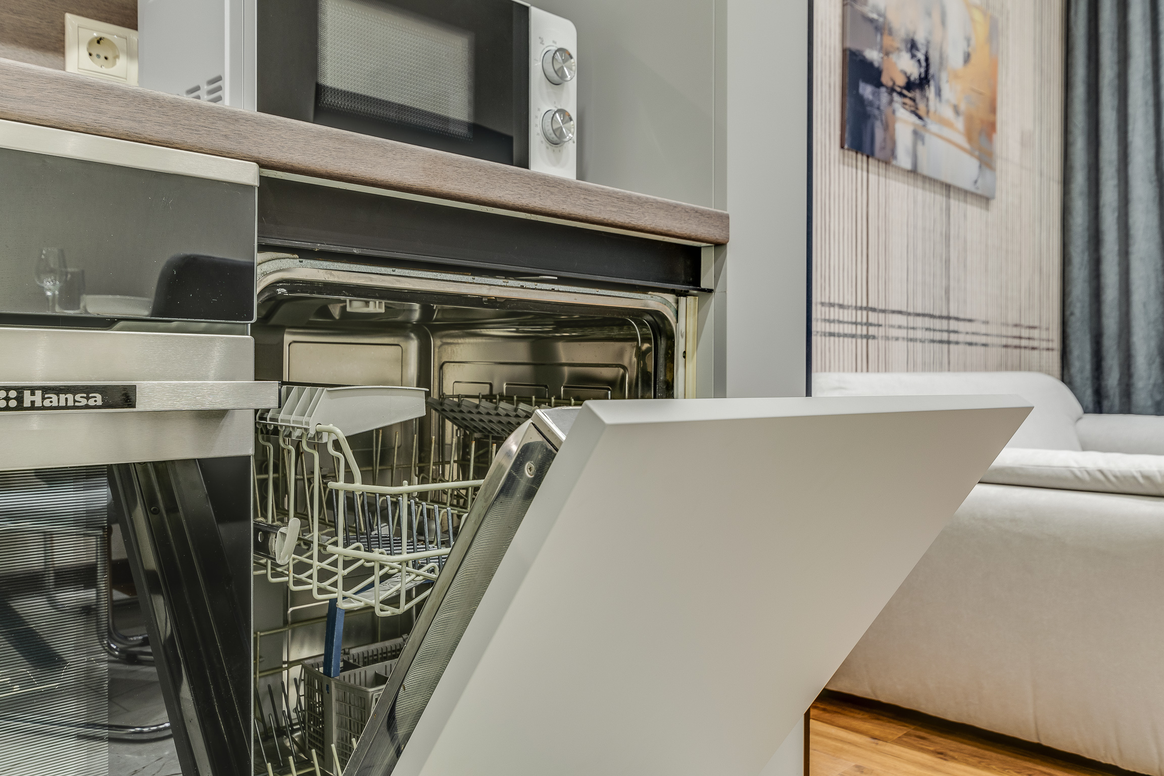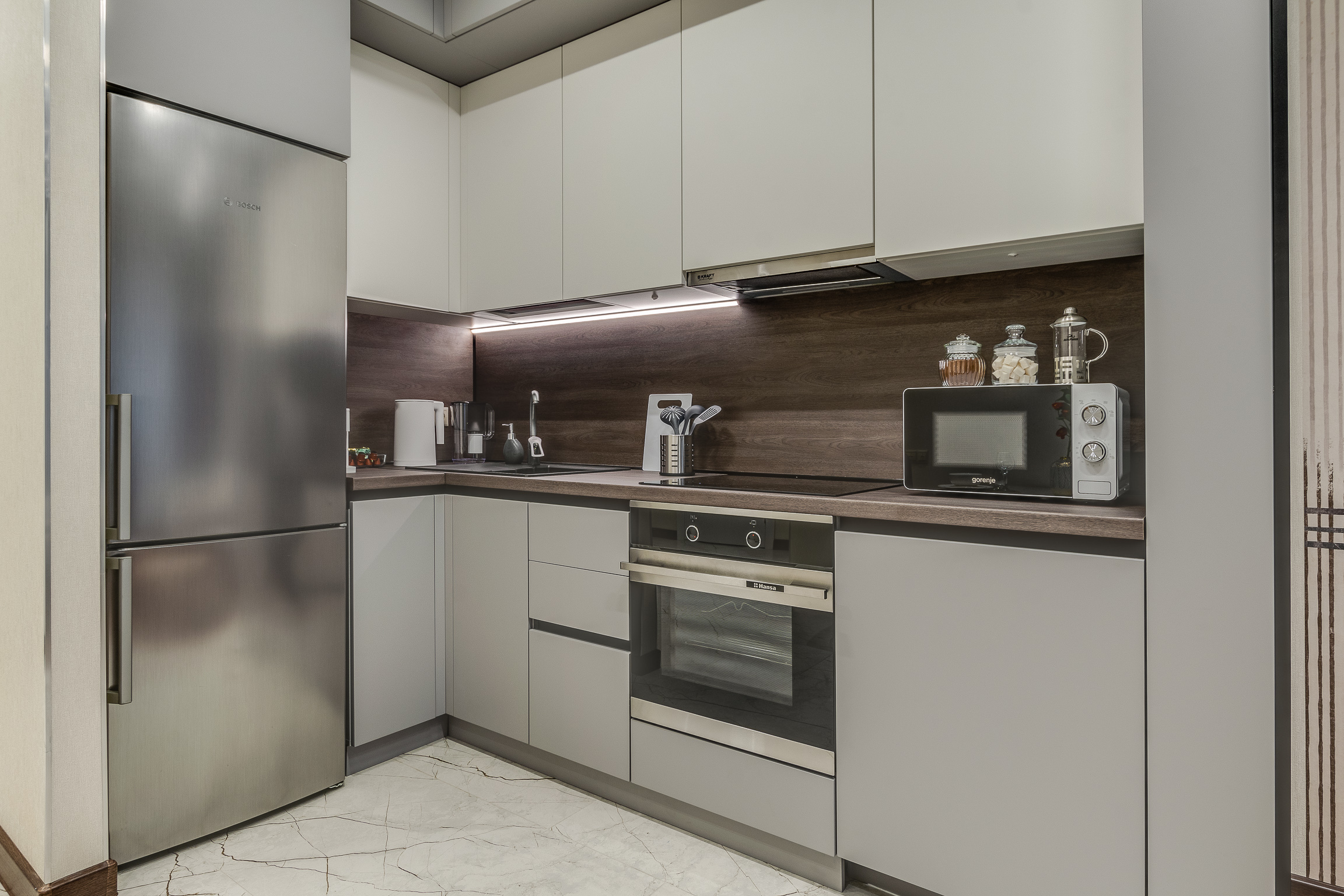 - в зоне кухни: кофемашина Nespresso, духовка, посудомойка, электрочайник, вытяжка, посуда для приготовления и приема пищи, чай, кофе, сахар, соль;