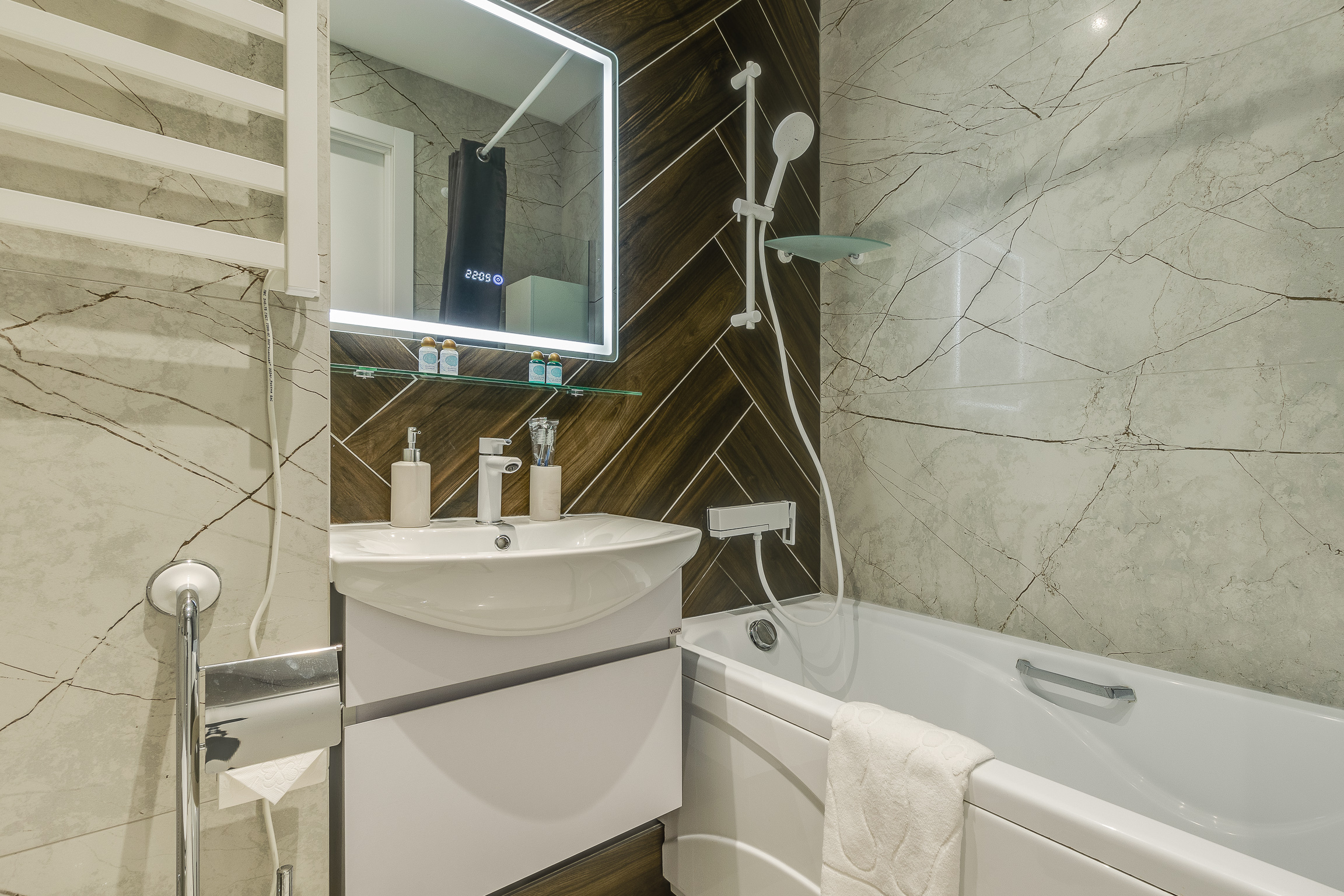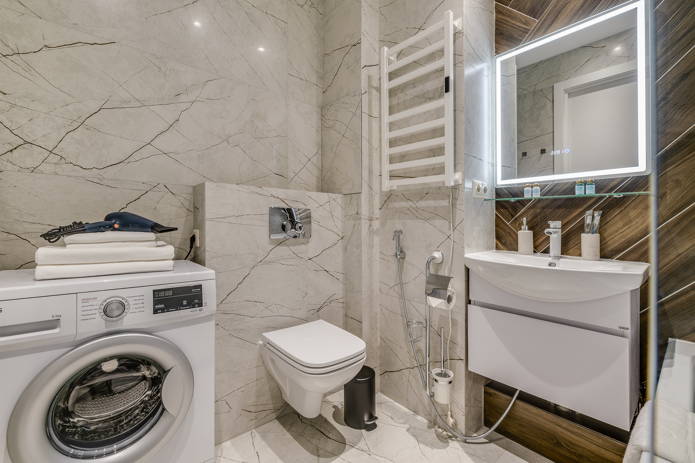 - в ванной комнате: ванна, фен, стиральная машина, комплекты полотенец, тапочки, зубные щетки, жидкое мыло, гель для душа, шампунь, стиральный порошок;