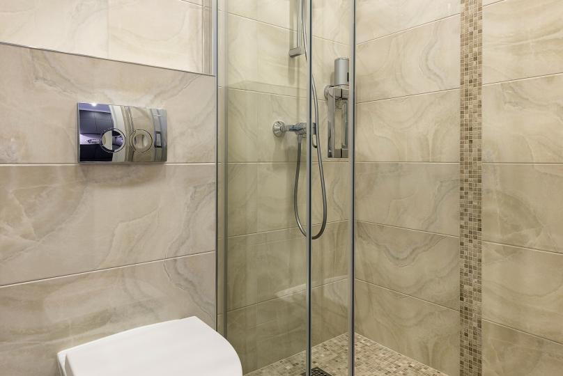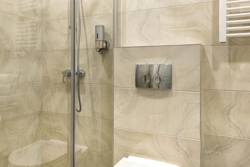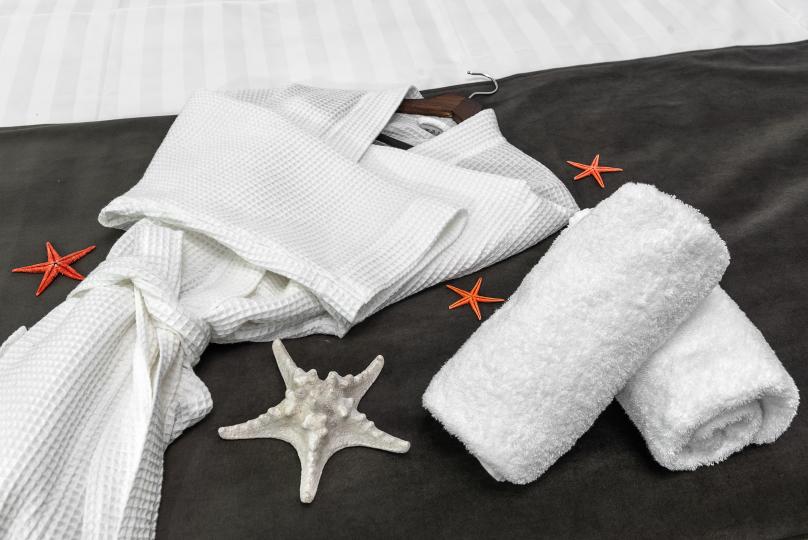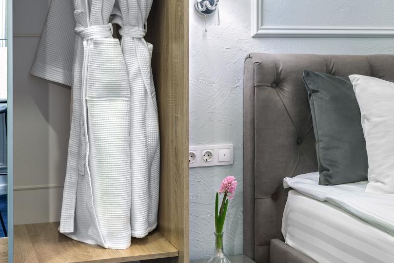 Также, всем необходимым оборудована ванная комната - фен, комплект полотенец, халаты, тапочки, фен, набор для личной гигиены, гладильные принадлежности. Дополнительный комфорт и уединенность обеспечивают качественная шумоизоляция и плотные шторы.