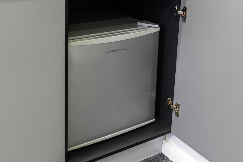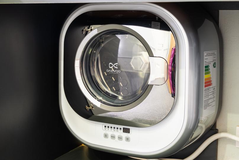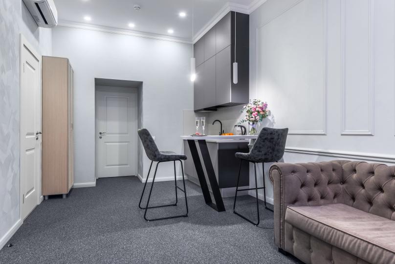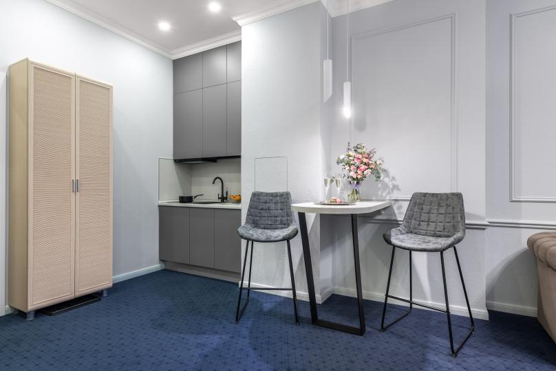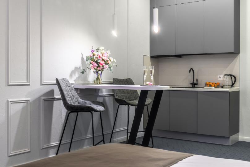 Кухонная зона в апартаментах оснащена холодильником, стиральной машиной, электрическим чайником, кофемашиной, вытяжкой, варочной поверхностью и набором стильной посуды.