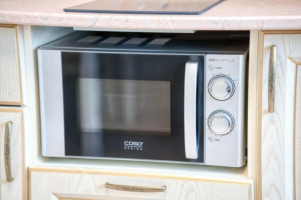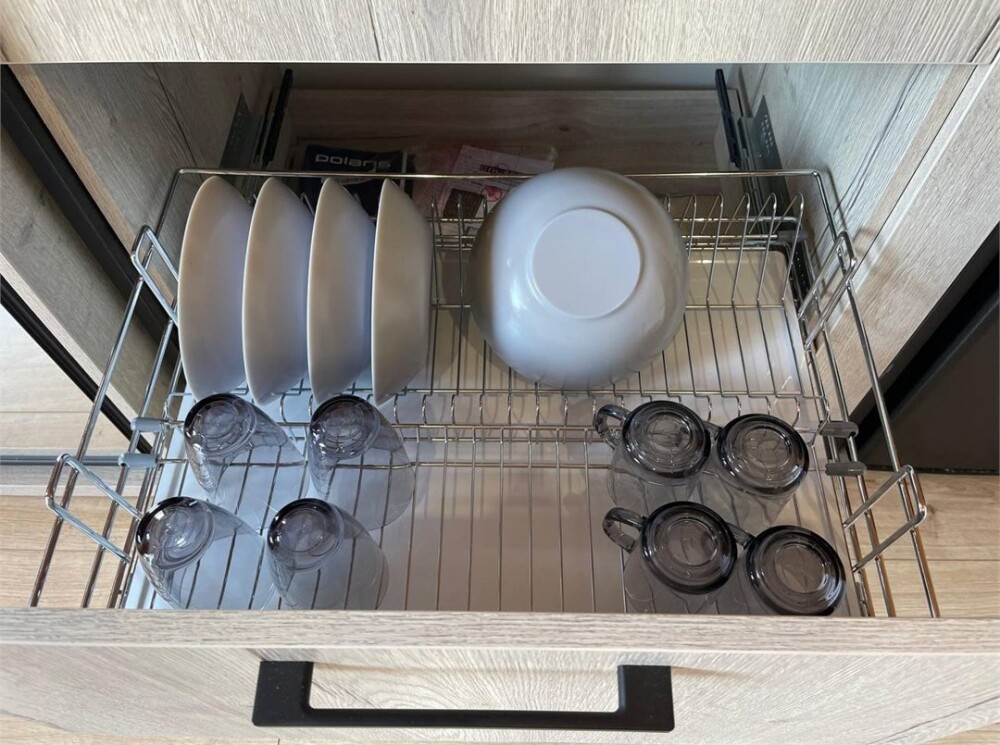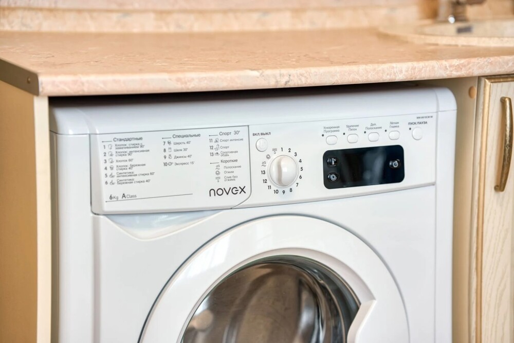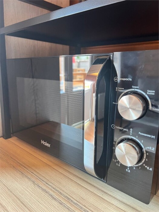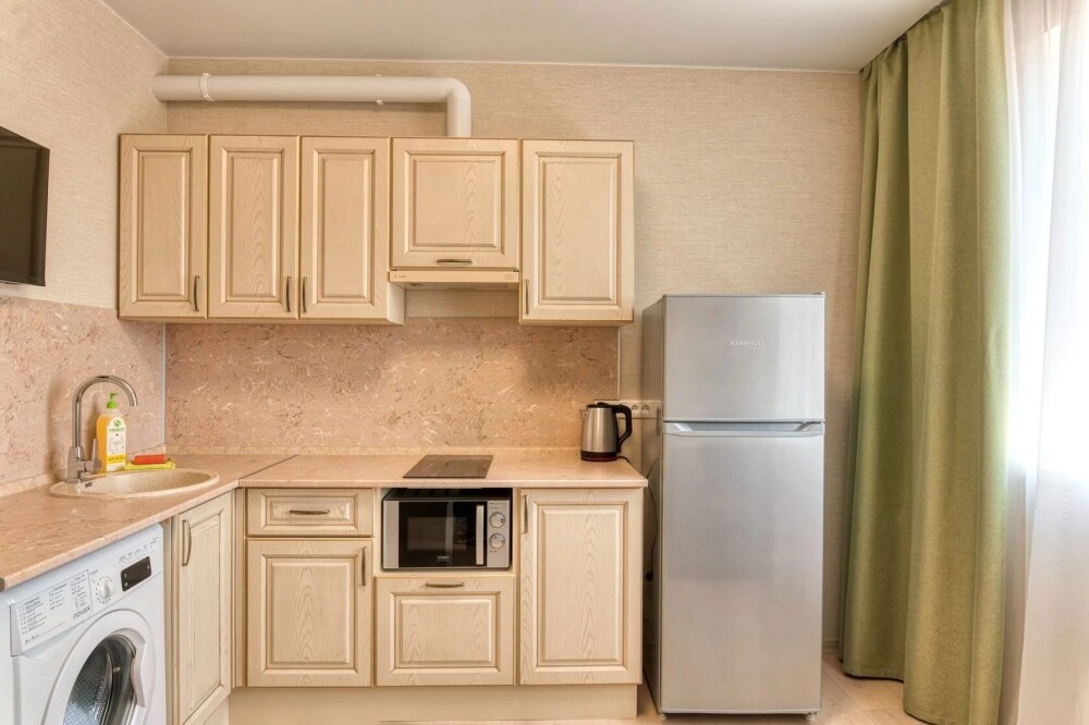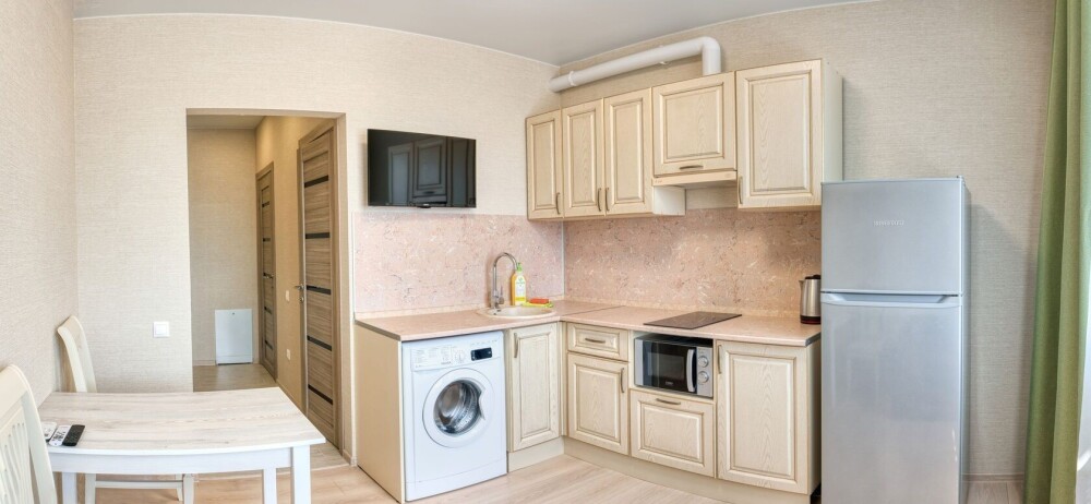 Кухонная зона: кухонный гарнитур, мойка, холодильник, чайник, микроволновка, набор посуды, варочная панель, кресло-кровать, стиральная машина.