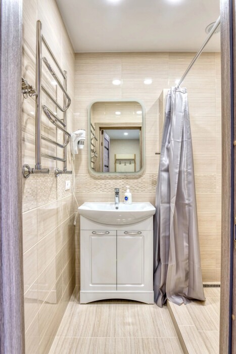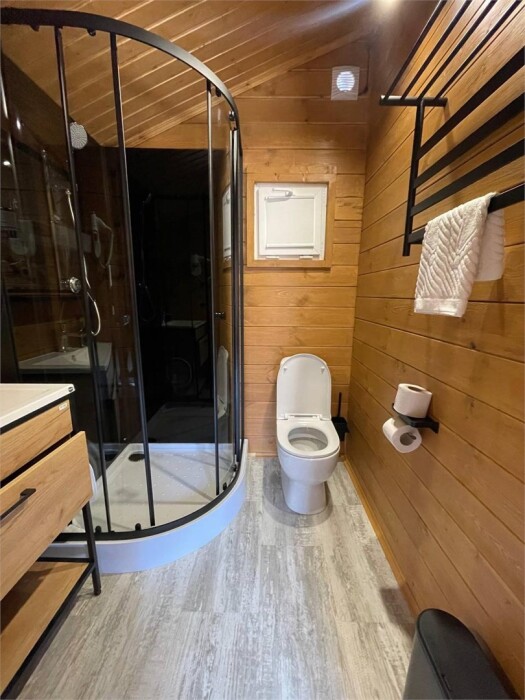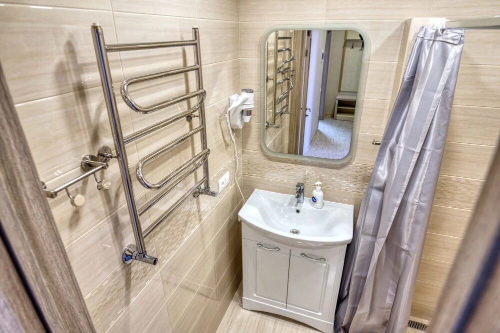Санузел (раздельный): душ, туалет, умывальник, фен, тапочки, сушилка для одежды, туалетные принадлежности.