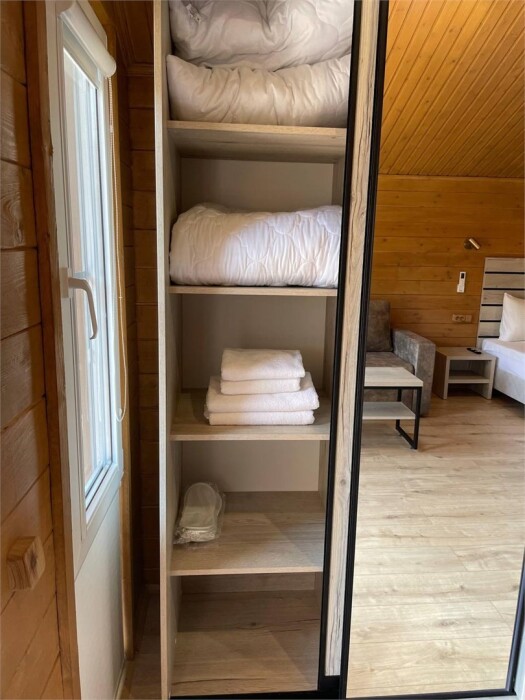 Этаж 1, 2 и 3. Спальня (отдельная): двуспальная кровать, кресло-кровать, сейф, трюмо, шкаф для одежды, тумбочки, утюг, гладильная доска.