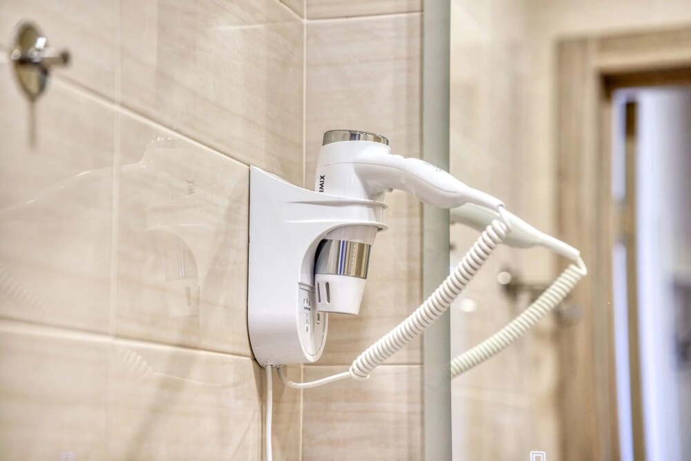 Санузел: душ, туалет, умывальник, фен, туалетные принадлежности.