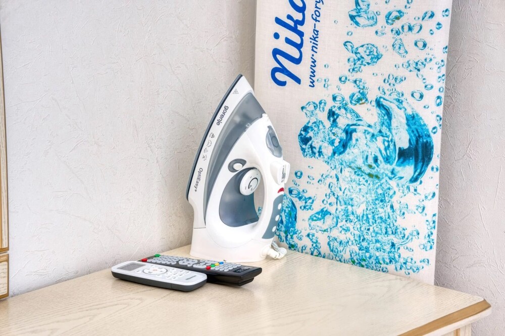 В доме: двуспальная кровать, двуспальный раскладной диван, шкаф для одежды, тумбочки, утюг, гладильная доска, холодильник, чайник, микроволновка, набор посуды, журнальный столик, ручной отпариватель.