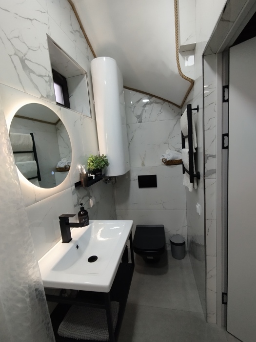 Удобная кровать с ортопедическим матрасом, оборудованная кухня, санузлы на каждом этаже. Летом Вас охладит кондиционер, зимой согреет индивидуальное отопление с тёплым полом. За свежий воздух отвечает бризер. В отделке использованы только качественные дорогие материалы.