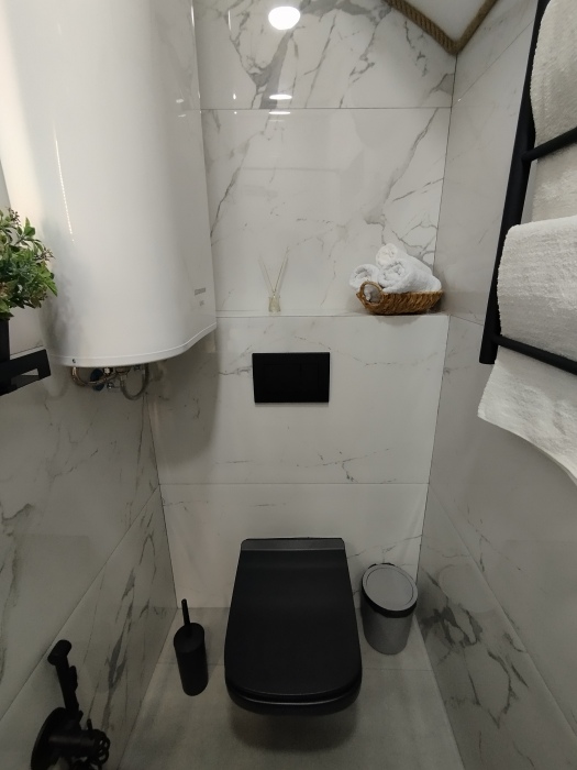 - Опрятный подвесной унитаз с гигиеническим душем и тропический душ.