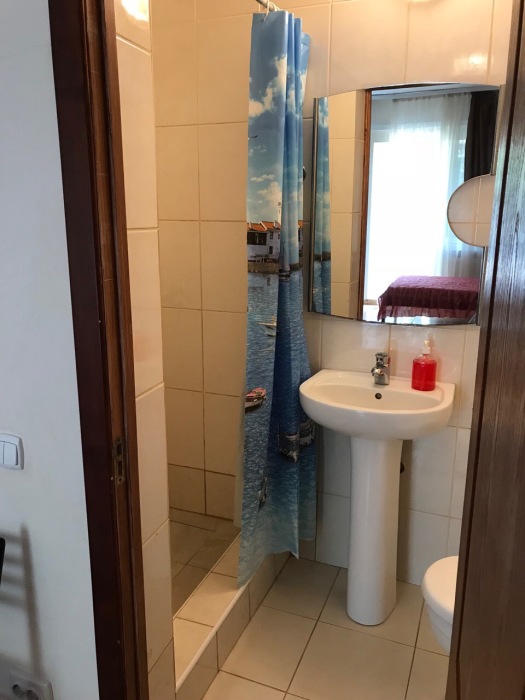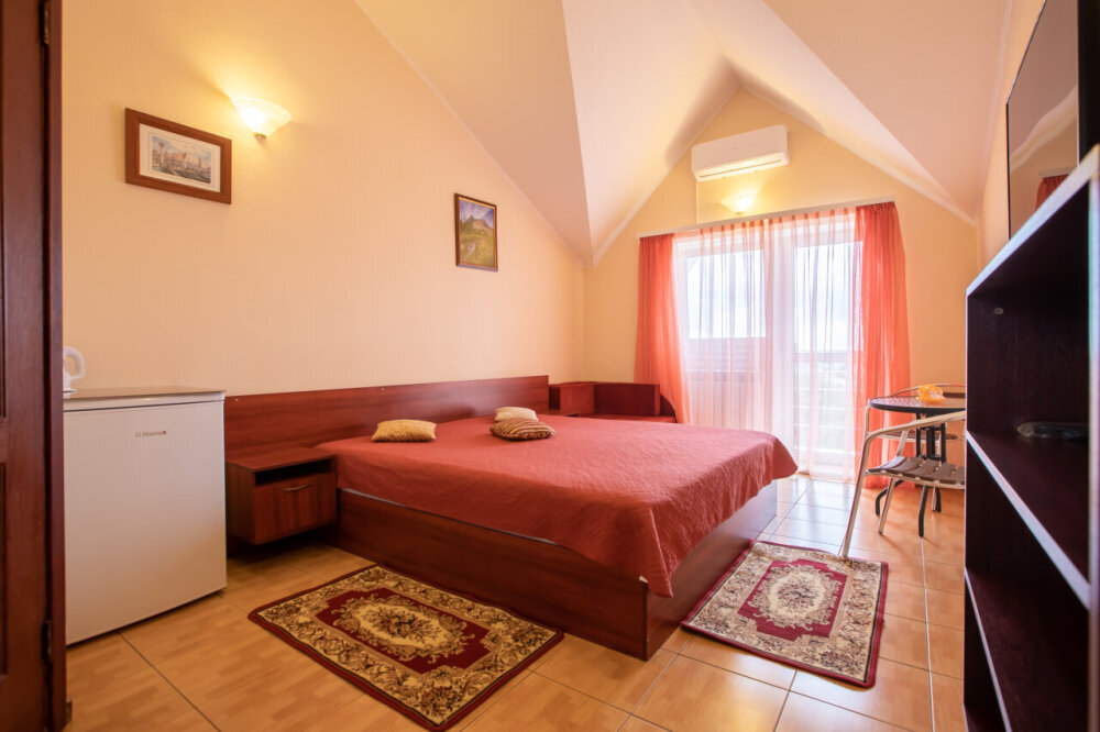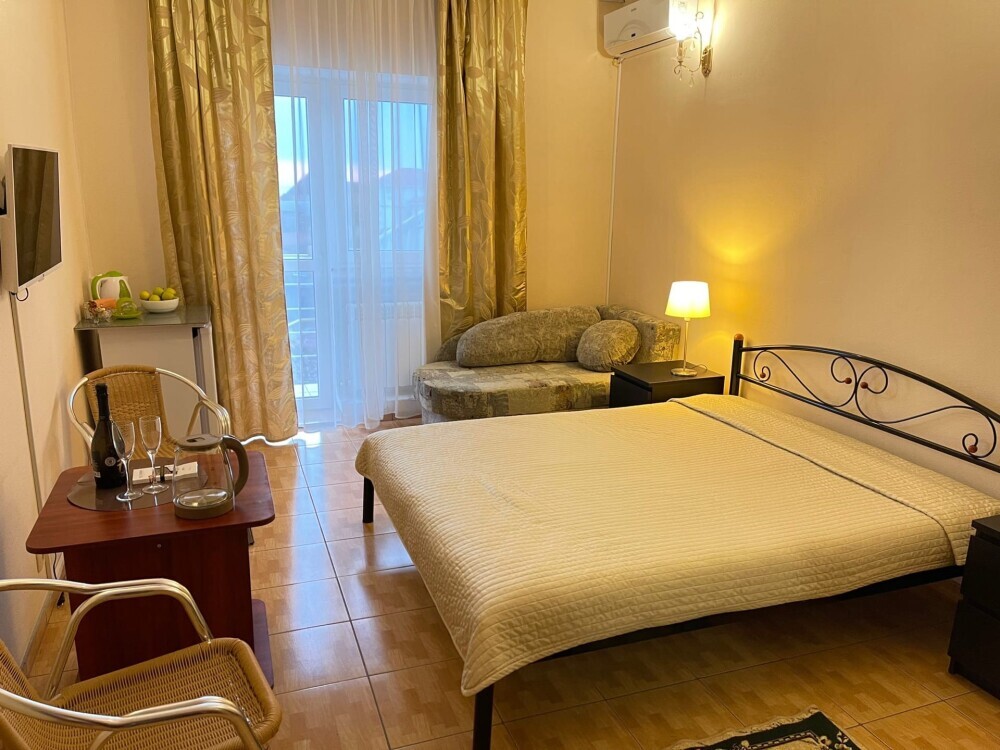 Однокомнатный номер с балконом , расположен на четвертом этаже. В номере двуспальная кровать, одноместный раскладной диван, шкаф, журнальный столик, вешалка. А так же холодильник, телевизор, кондиционер, туалет и душевая кабинка.