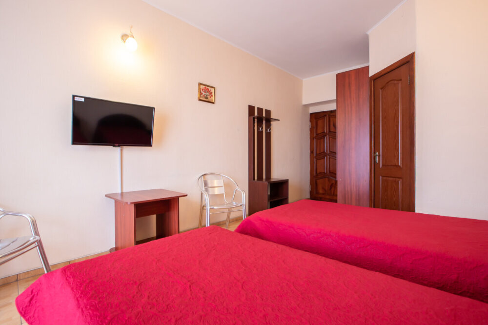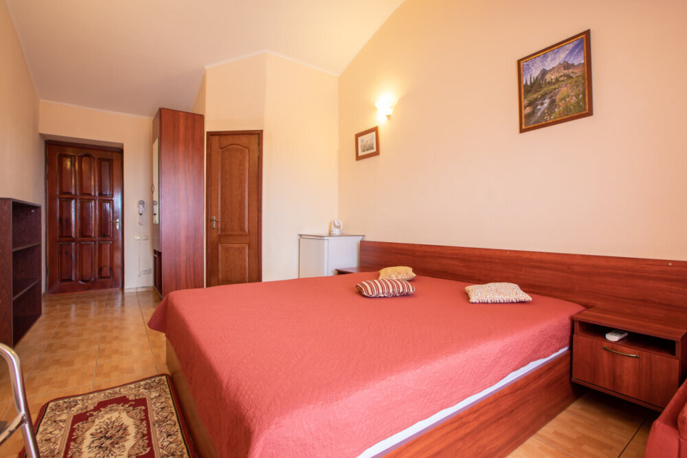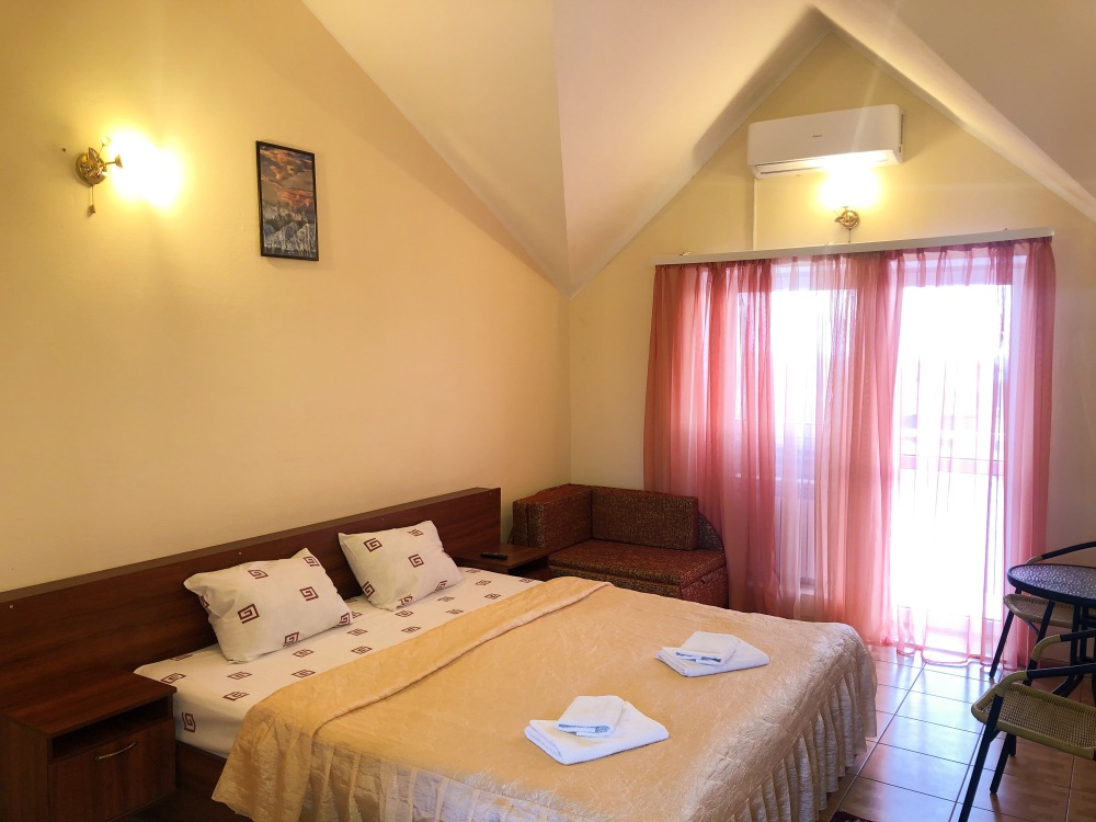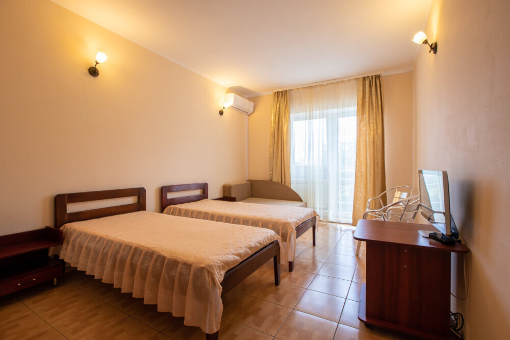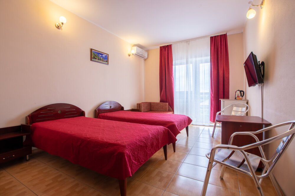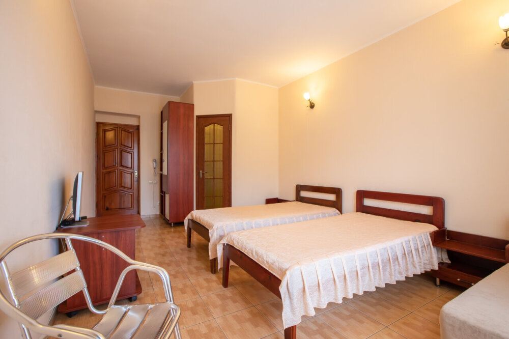 Однокомнатный двухместный номер с балконом, расположен на втором этаже. В номере две односпальные кровати, одноместный раскладной диван, шкаф, журнальный столик, вешалка. А так же холодильник, телевизор, кондиционер, туалет и душевая кабинка.