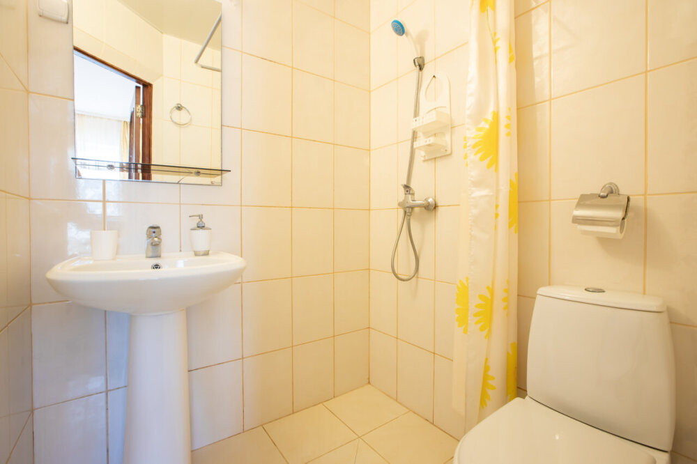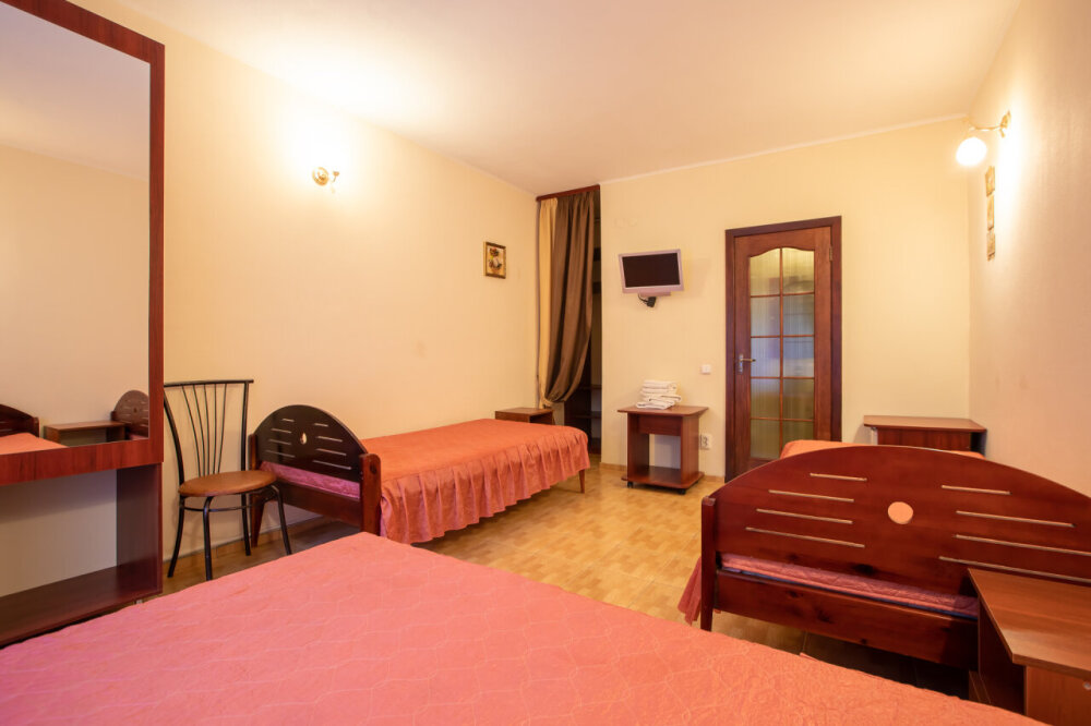 Однокомнатный номер расположен на первом этаже. В номере три односпальные кровати, шкаф, журнальный столик, вешалка. А так же холодильник, телевизор, кондиционер, туалет и душевая кабинка.