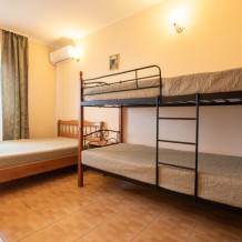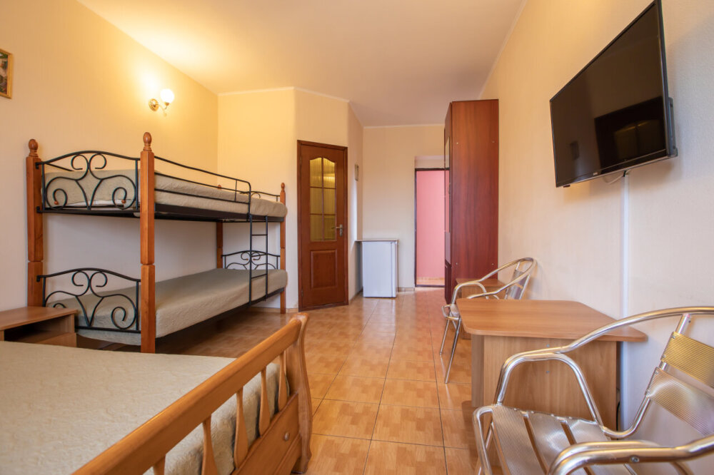 Однокомнатный семейный номер с балконом. расположен на втором этаже. Номер со всеми удобствами. В номере двуспальная кровать , двухъярусная кровать, журнальный столик, шкаф, стулья. А так же холодильник, телевизор, кондиционер, душевая кабинка и туалет.