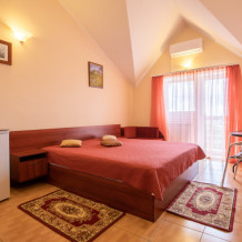 Однокомнатный двухместный номер с балконом , расположен на третьем этаже. В номере две односпальные кровати, одноместный раскладной диван, шкаф, журнальный столик, вешалка. А так же холодильник, телевизор, кондиционер, туалет и душевая кабинка.