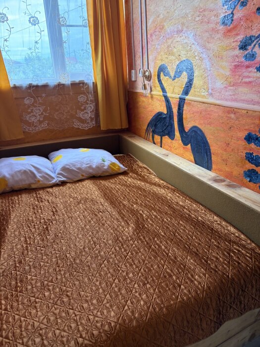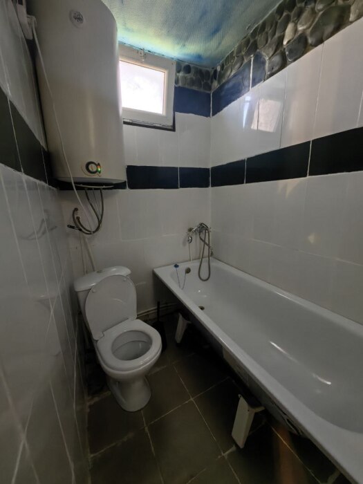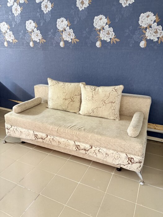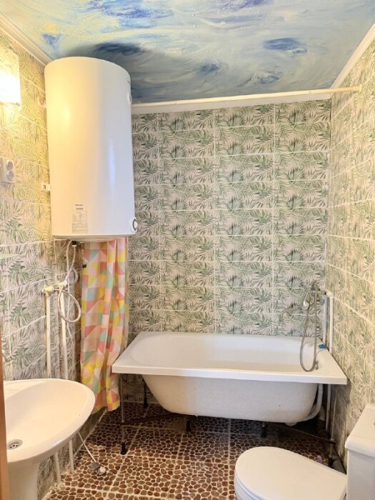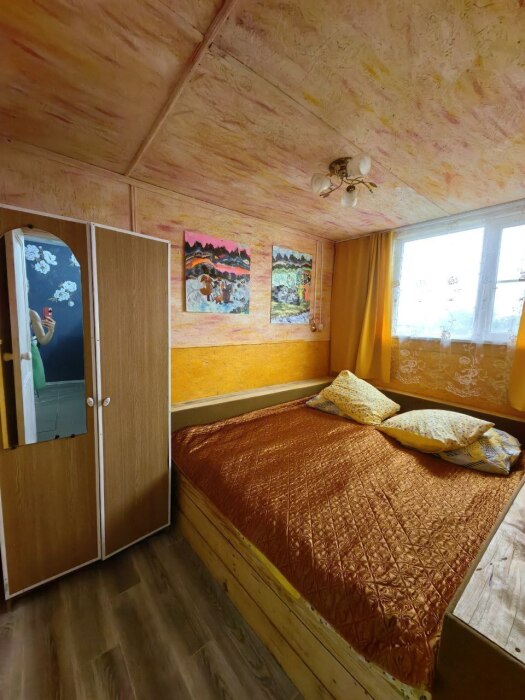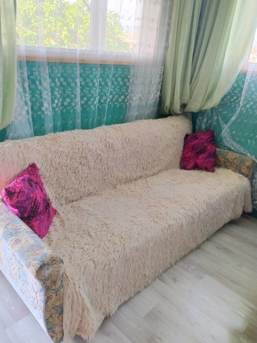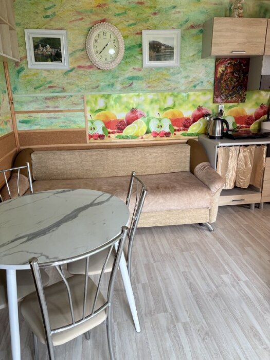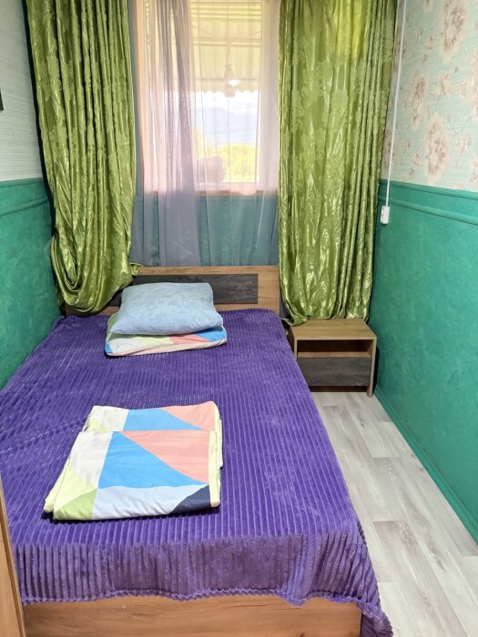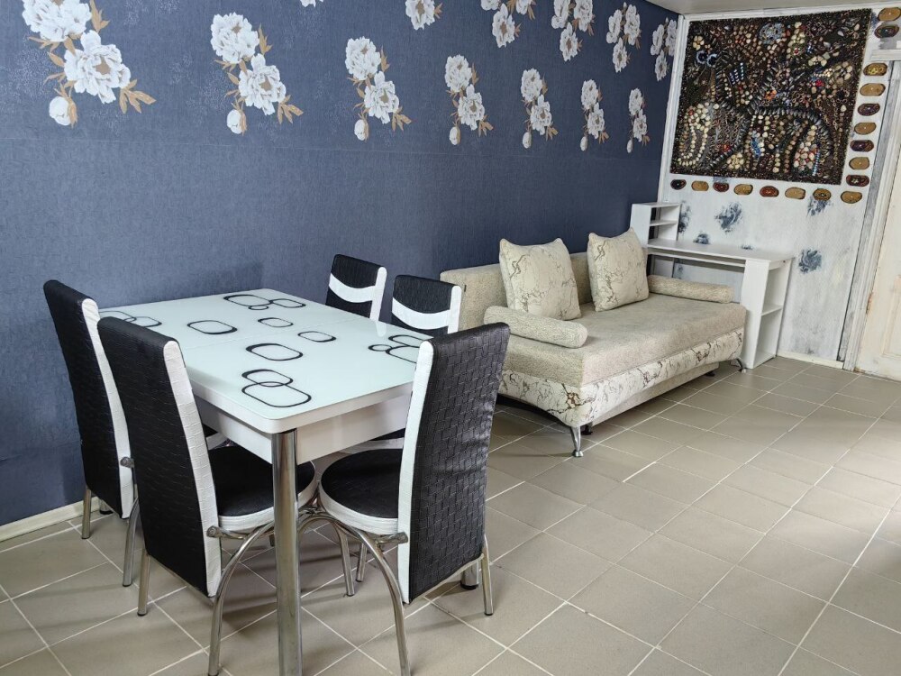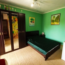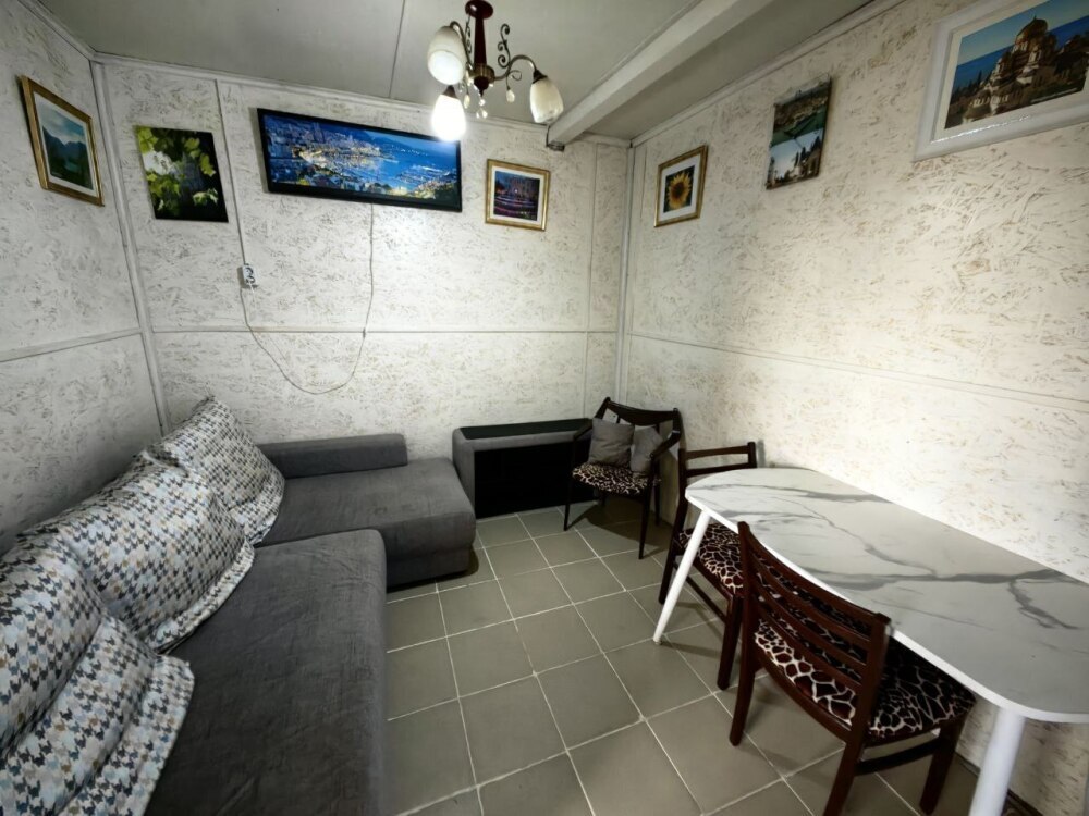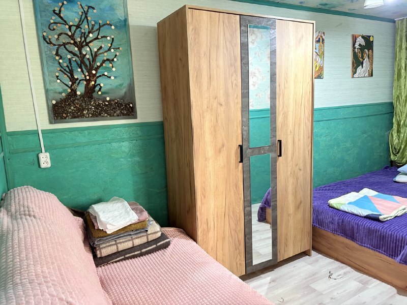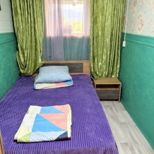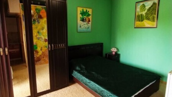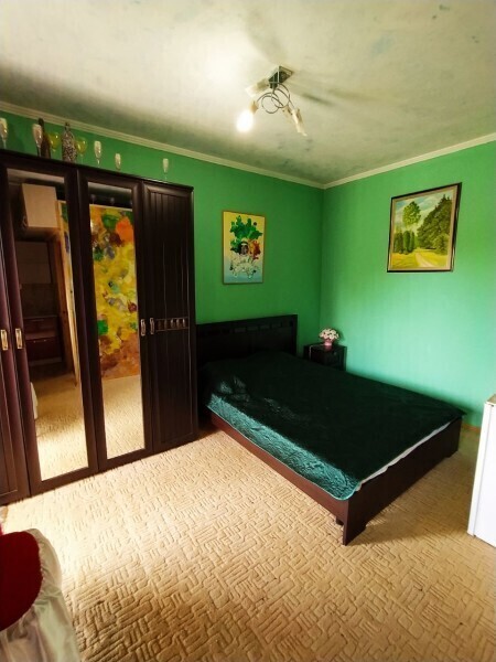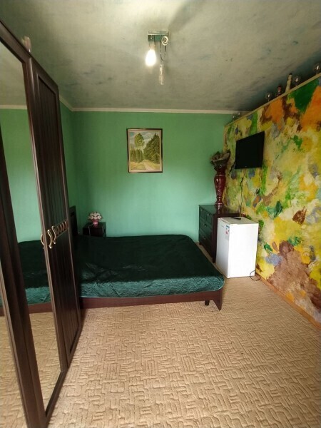 В комнате располагается 2-х спальная кровать, раскладной диван, вместительный шкаф, прикроватная тумба, два больших окна и кондиционер. На кухне есть посуда, холодильник и плита. Санузел совмещенный с душем.