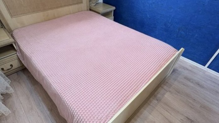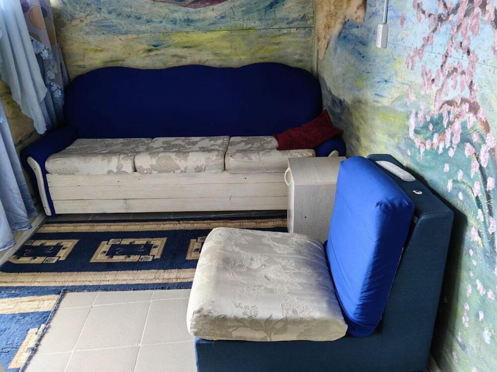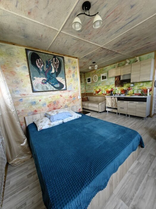 2-спальная кровать, раскладной диван, кресло, шкаф, прикроватная тумба, кондиционер. На кухне есть посуда, холодильник и плита. Санузел совмещен с душем.