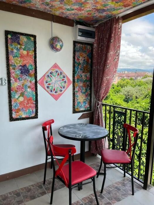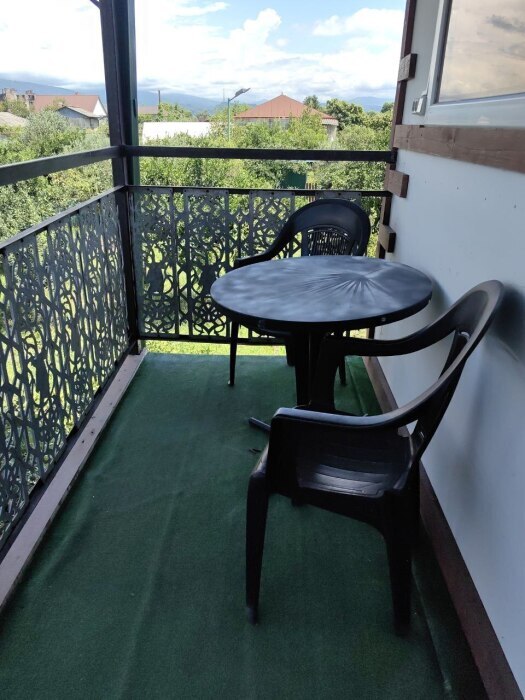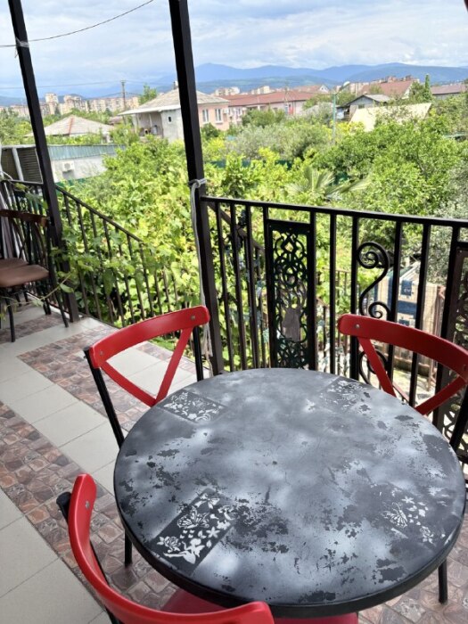 Просторные 2-комнатные апартаменты - отличный вариант для семьи с детьми или компании до пяти человек. Есть все необходимое для комфортного проживания. В спальне установлена большая и шикарная кровать, а также шкаф для вещей. В гостиной, объединенной с кухней, расположены два дивана (один из них раскладной). На кухне имеется бытовая техника, посуда и холодильник. С балкона открывается вид на мандариновый сад и горы вдали.