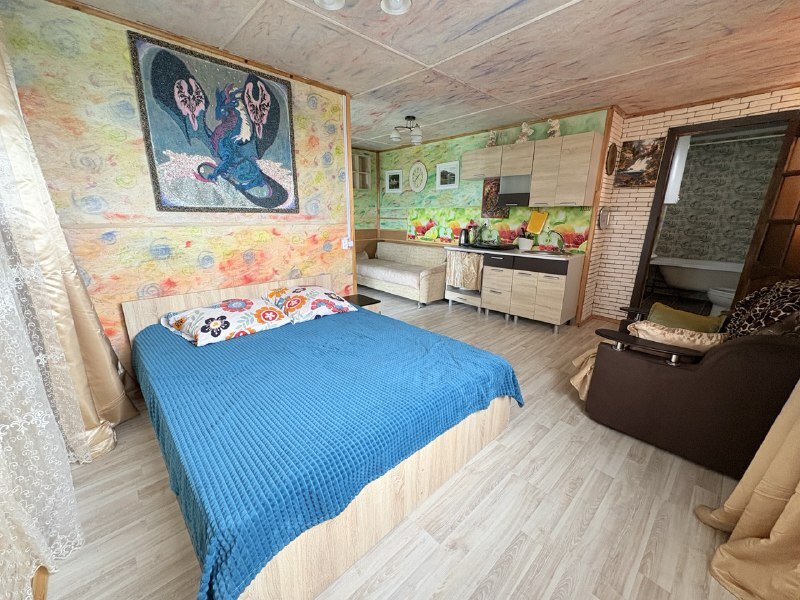 Уютная студия оборудованная всеми удобствами, включая кухню, а также балкон с видом на сад. В комнате находится 2-спальная кровать, раскладной диван, кресло, шкаф, прикроватная тумба, кондиционер. На кухне есть посуда, холодильник и плита. Подойдет для семейного отдыха.