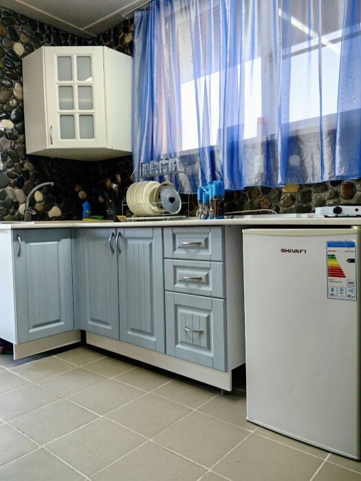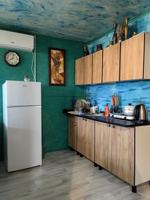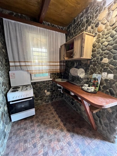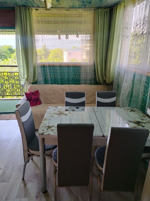 Просторный номер в частном доме, оборудованный всеми удобствами, включая кухню и собственную веранду в тени, где вы можете комфортно проводить время. В душевой установлена стиральная машина, что является значительным преимуществом для гостей.