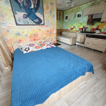 Уютная студия оборудованная всеми удобствами, включая кухню, а также балкон с видом на сад. В комнате находится 2х-спальная кровать, раскладной диван, диван, шкаф, прикроватная тумба, кондиционер. На кухне есть посуда, холодильник и плита. Подойдет для семейного отдыха.