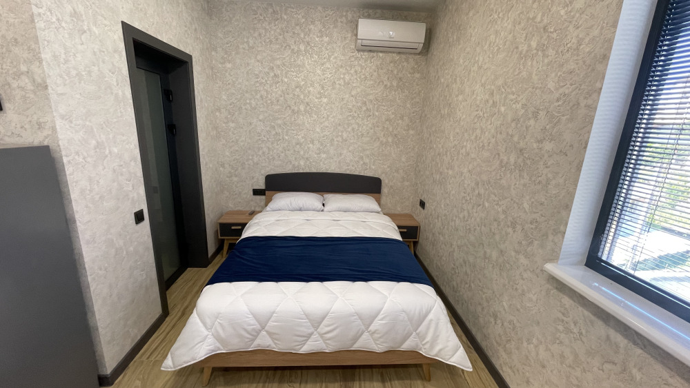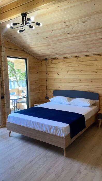 Дети до 6 лет - можно без отдельного спального места. В доме большая двуспальная кровать с прикроватными тумбочками, шкаф, двуспальный раскладной диван, холодильник, кондиционер, санузел, постельное бельё и доступ в интернет (Wi-Fi), терраса с садовой мебелью.