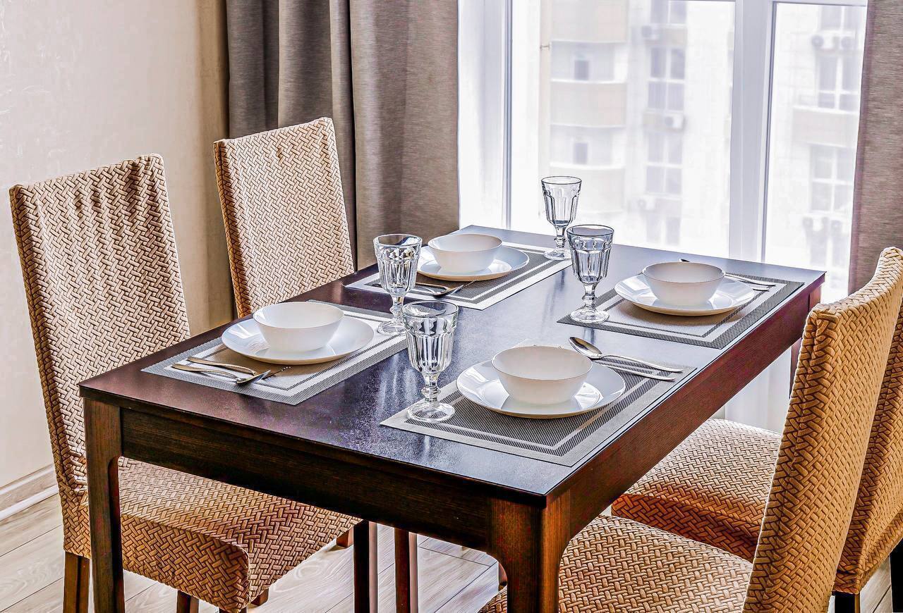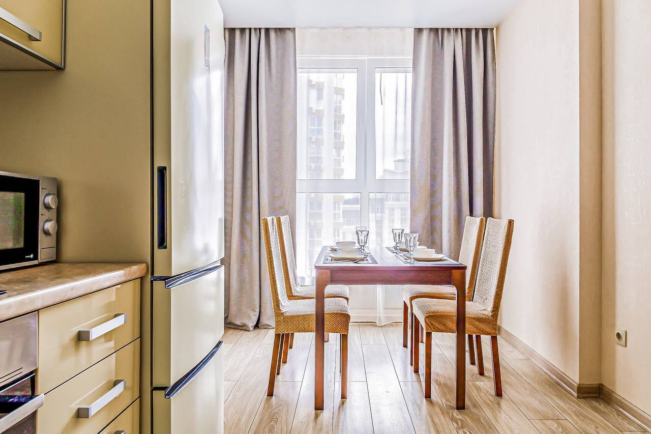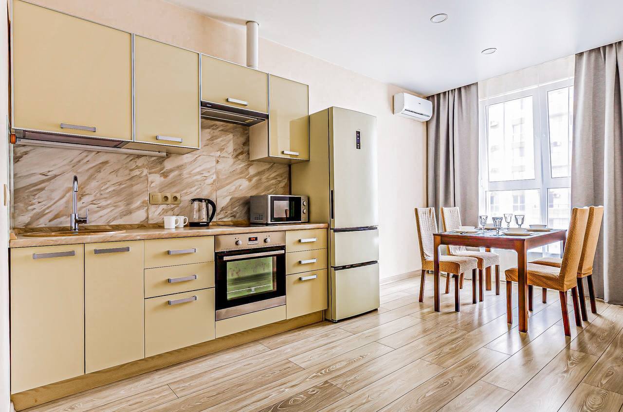 - Уютная кухня с обеденным столом, стульями, современным кухонным гарнитуром, электроплитой, холодильником, микроволновой печью, электрочайником, посудой и всем необходимым для приготовления вкусных блюд.