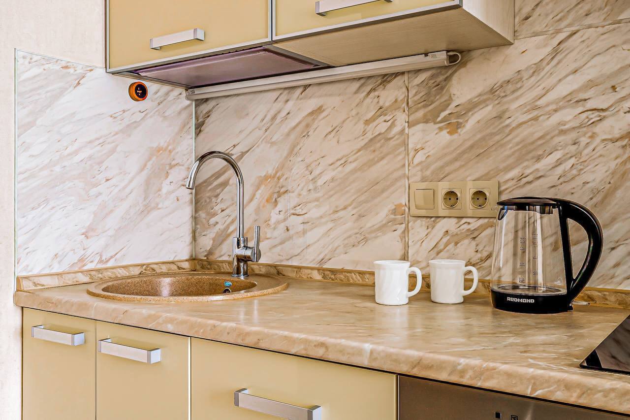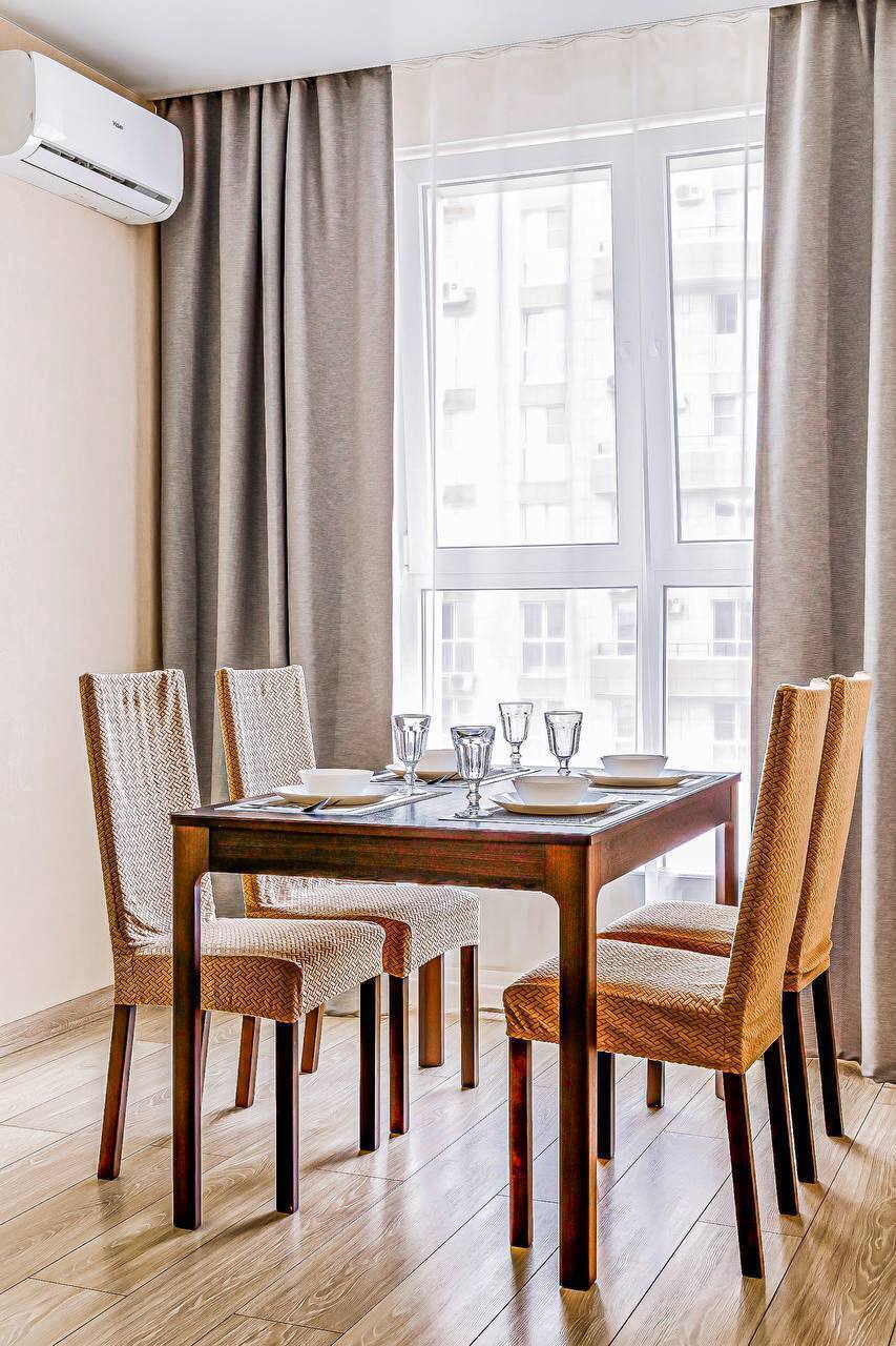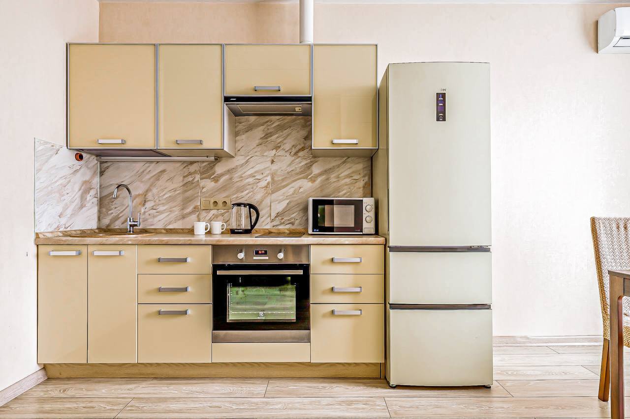 - Уютная кухня с обеденным столом, стульями, современным кухонным гарнитуром, электроплитой, холодильником, микроволновой печью, электрочайником, посудой и всем необходимым для приготовления вкусных блюд.