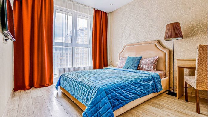 - Стильная спальня с большой двуспальной кроватью, прикроватной тумбой, рабочим столом, телевизором smart.