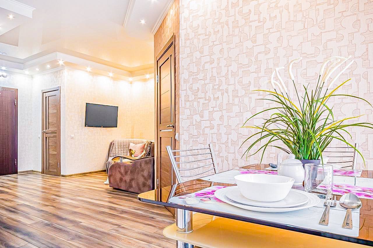 В квартире выполнен красивый, дорогой ремонт, удобная, качественная мебель и техника. В каждой комнате установлен телевизор. Кухонная зона оборудована всей необходимой мебелью и техникой, а также укомплектована посудными принадлежностями. Постельное белье, полотенца, средства личной гигиены, тапочки предоставляем.