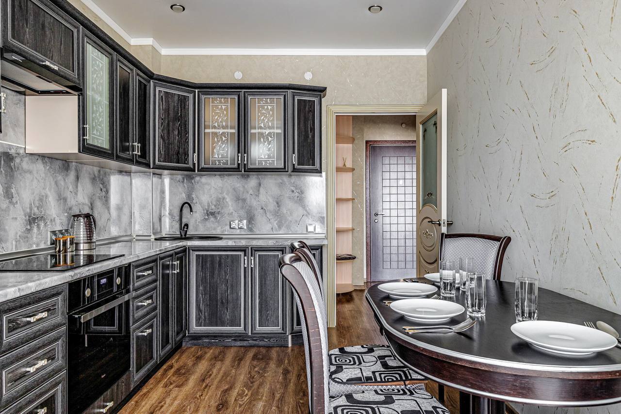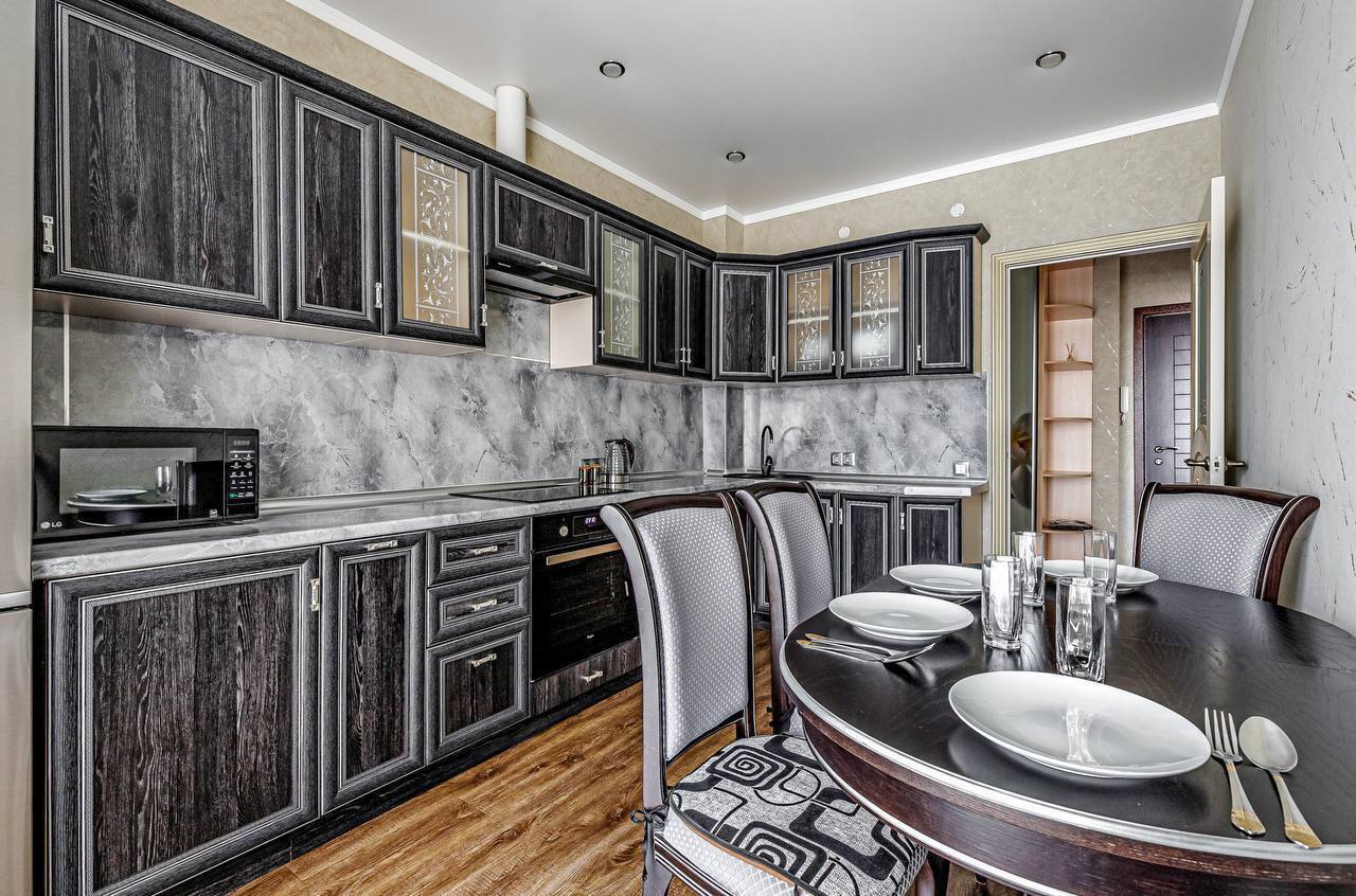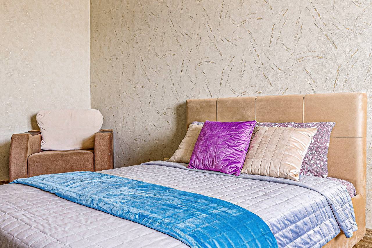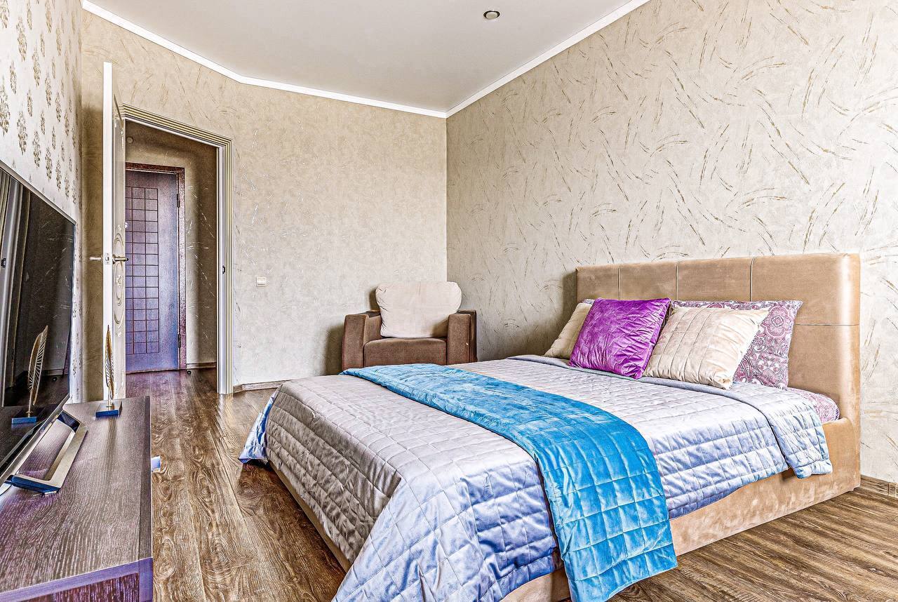 В квартире две раздельные комнаты, большая и просторная кухня. Спальных мест 2+2+2 (две двуспальные кровати и двуспальный диван). В квартире есть все необходимое для проживания, кабельное ТВ и wi-fi, качественное постельное белье 100% хлопок, комплект полотенец, посуда в полной комплектации (включая фужеры), утюг, гладильная доска, фен, тапочки, шампунь. Современная укомплектованная кухня: духовка, микроволновка, посуда.