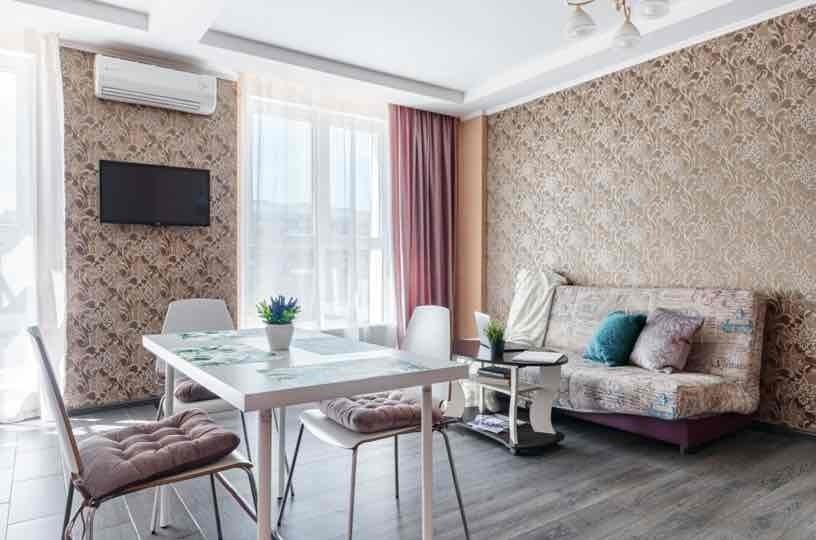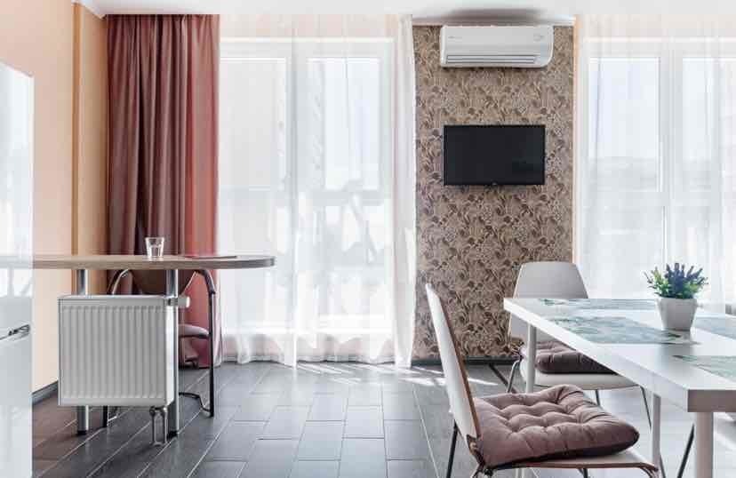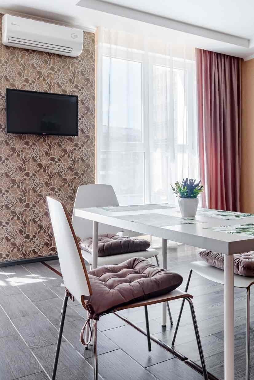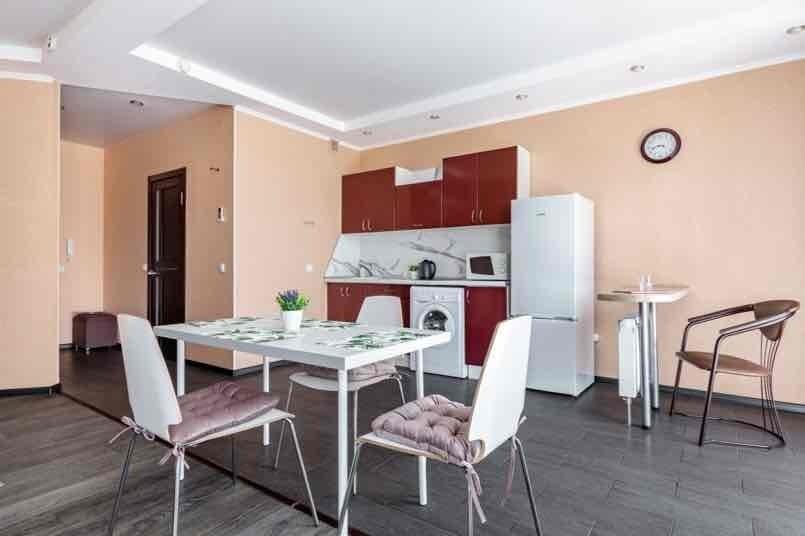- Кухня с обеденным столом, СВЧ, холодильником, чайником и посудой. А также приветственные пакетики чая, сахар, соль .