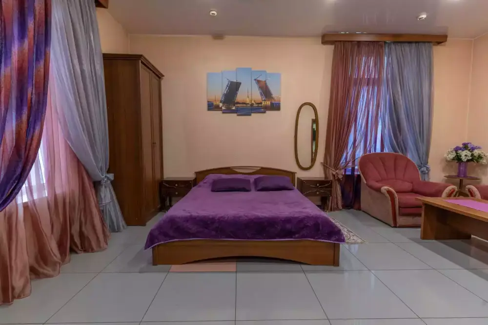 В номере ванная (халат, полотенца, тапочки, гигиенические принадлежности), раздельный санузел. Также диван, кресло, кофейный столик, шкаф для одежды и комод.