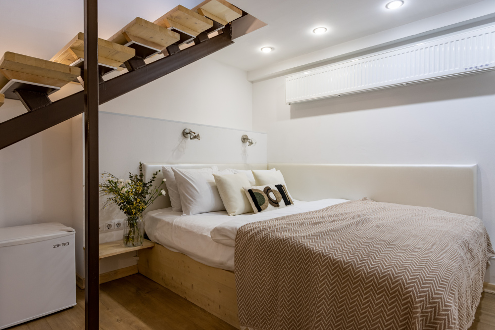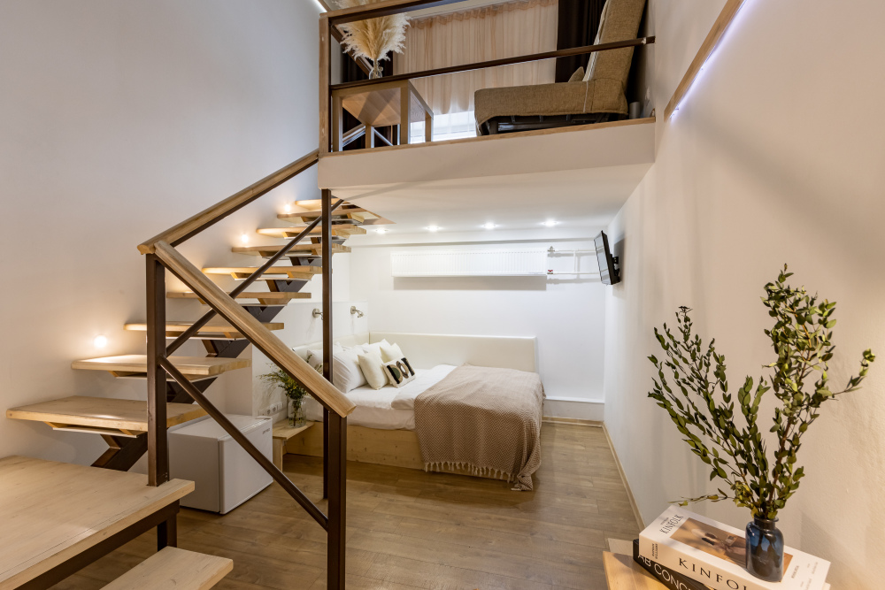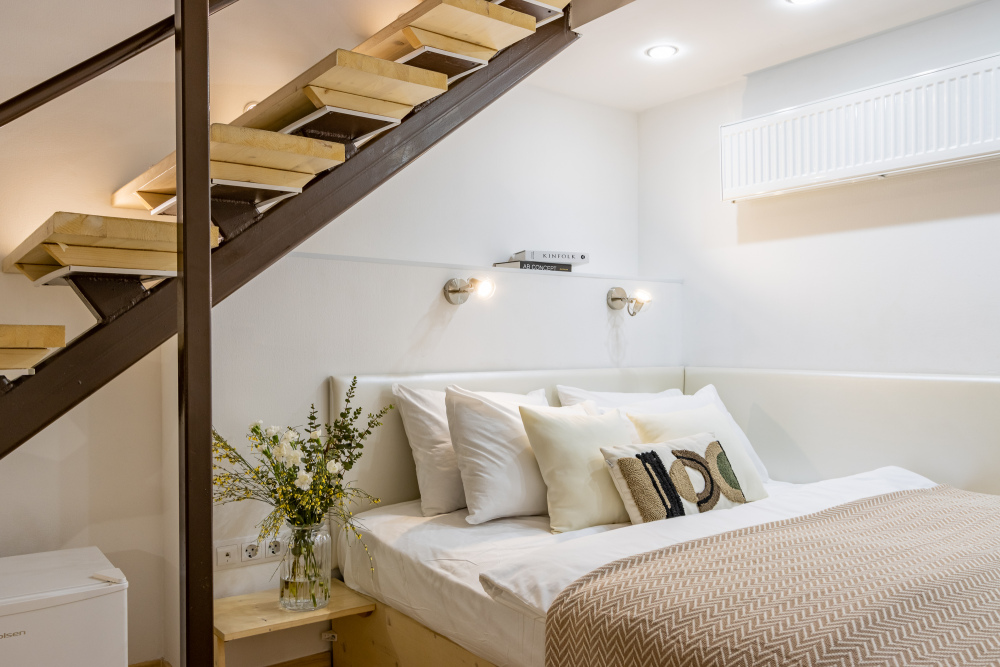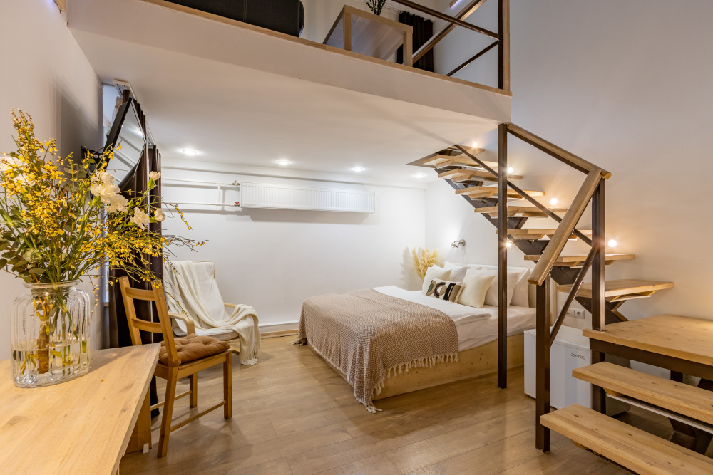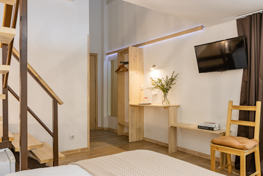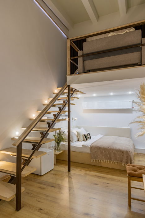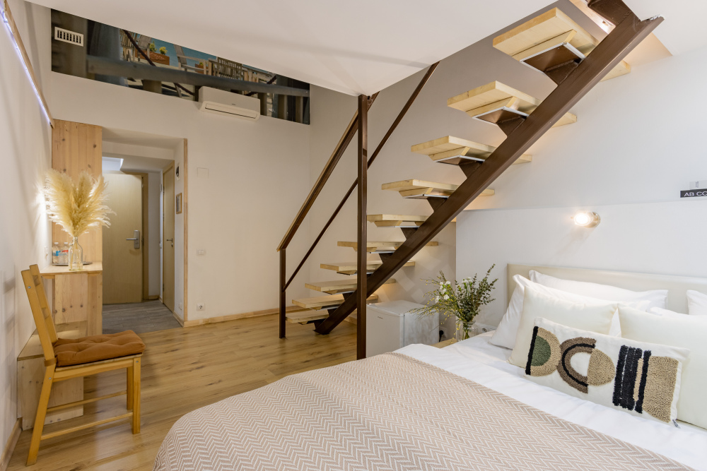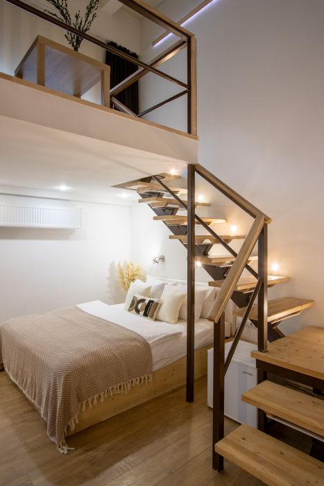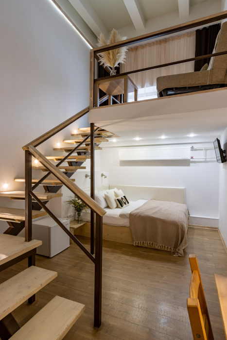 Дуплекс номера отеля комфортабельные и двухэтажные.Номера оборудованы одной большой двухспальной кроватью.Все номера выполнены в соответствии с современными европейскими тенденциями и оформлены в авторском стиле. В каждом номере есть ванная комната. Номера выполнены в спокойных тонах. Площадь составляет 20 - 22 кв.м. Номера располагают рабочим местом со столом и стулом. Дополнительное спальное место, диван на втором уровне.