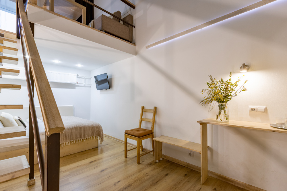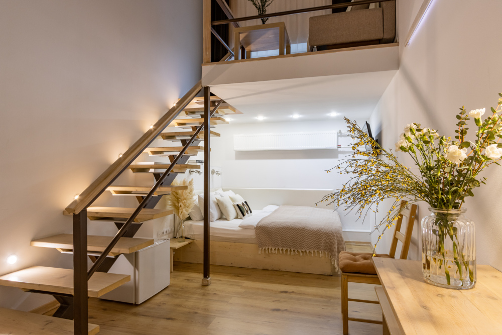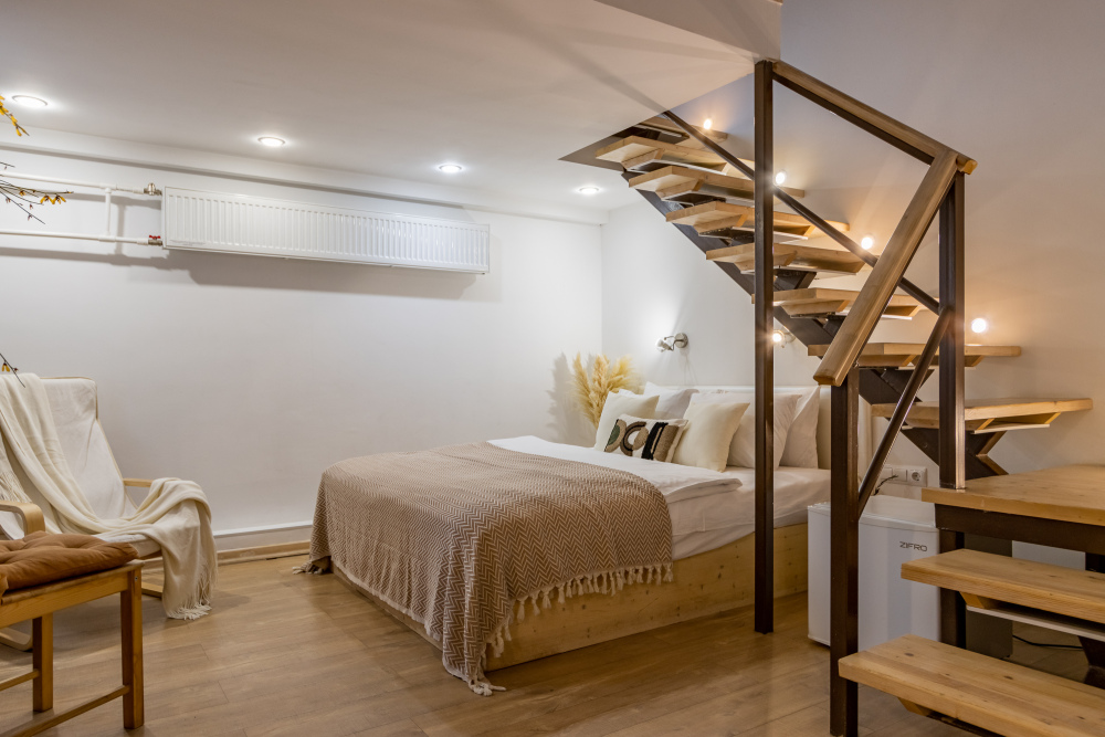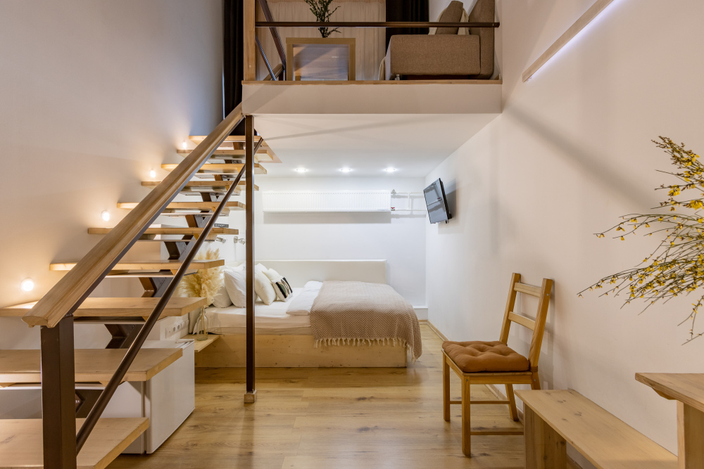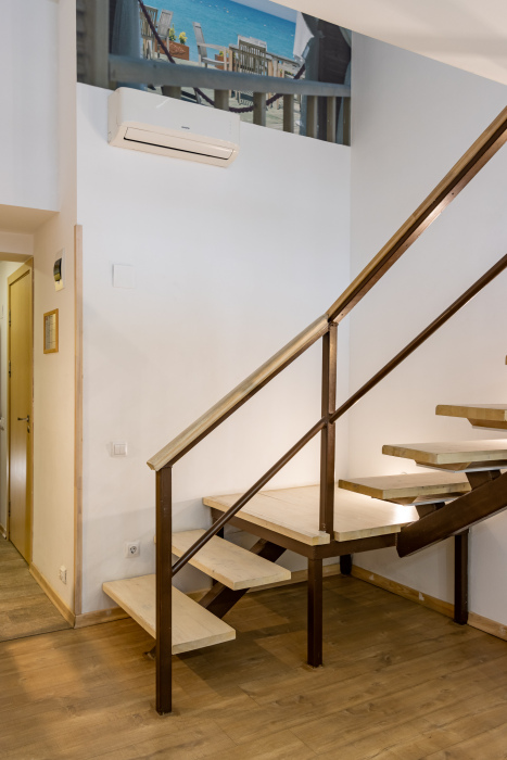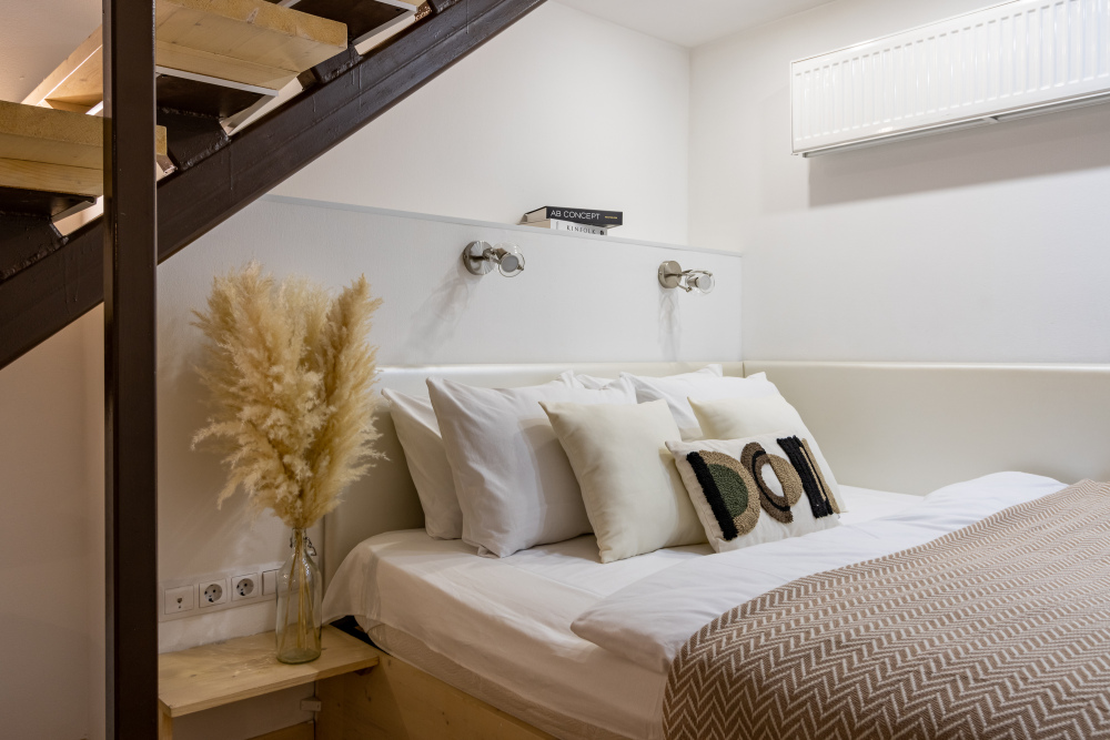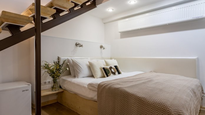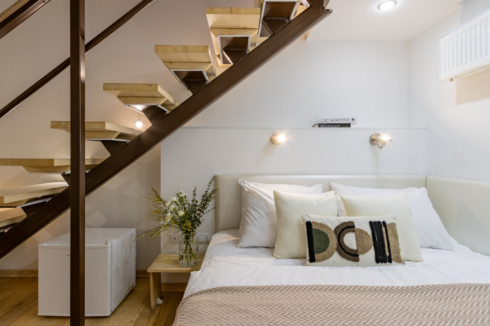 Дуплекс номера отеля комфортабельные и двухэтажные.Номера оборудованы одной большой двухспальной кроватью.Все номера выполнены в соответствии с современными европейскими тенденциями и оформлены в авторском стиле. В каждом номере есть ванная комната. Номера выполнены в спокойных тонах. Площадь составляет 20 - 22 кв.м. Номера располагают рабочим местом со столом и стулом. Дополнительное спальное место, диван на втором уровне.