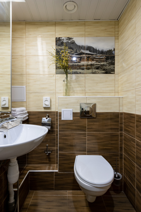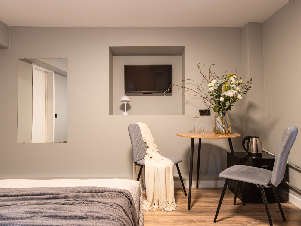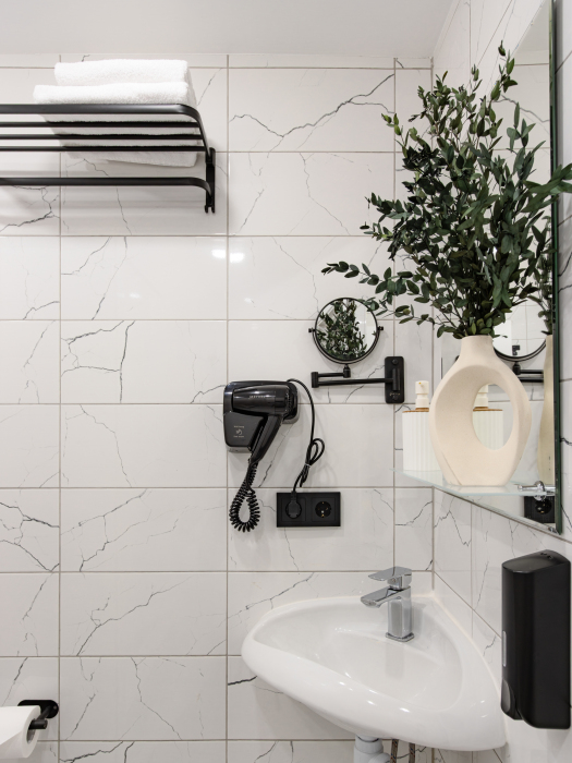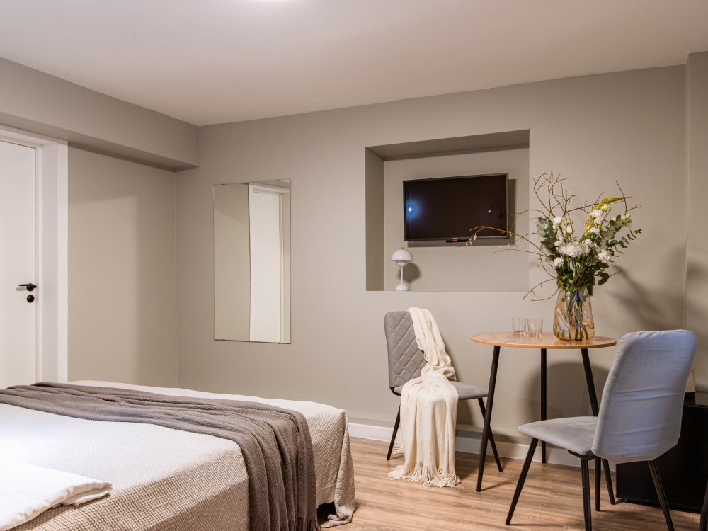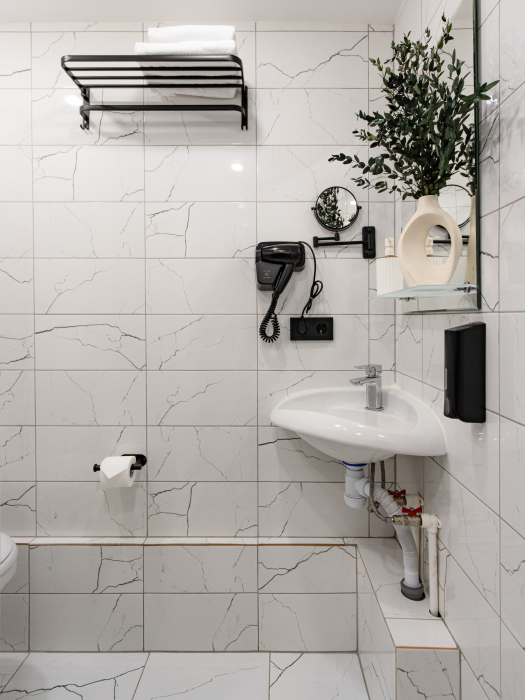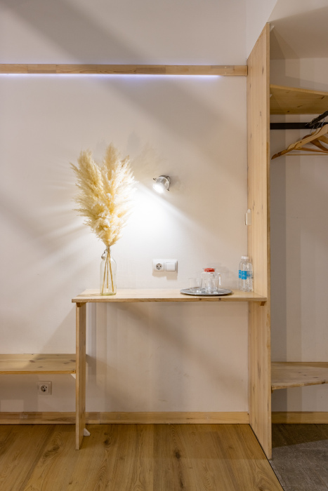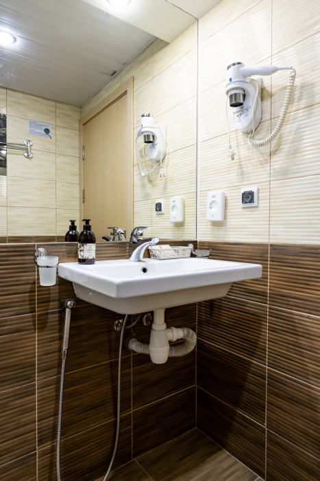 Номер оборудован маленьким окном и оформлен в спокойных тонах. Пространство организовано так, чтобы обеспечить гостям всё необходимое для комфортного пребывания. В номере: электрочайник, телевизор с поддержкой Smart, зеркало, комплект полотенец, набор гигиенических средств, тапочки, бокалы.