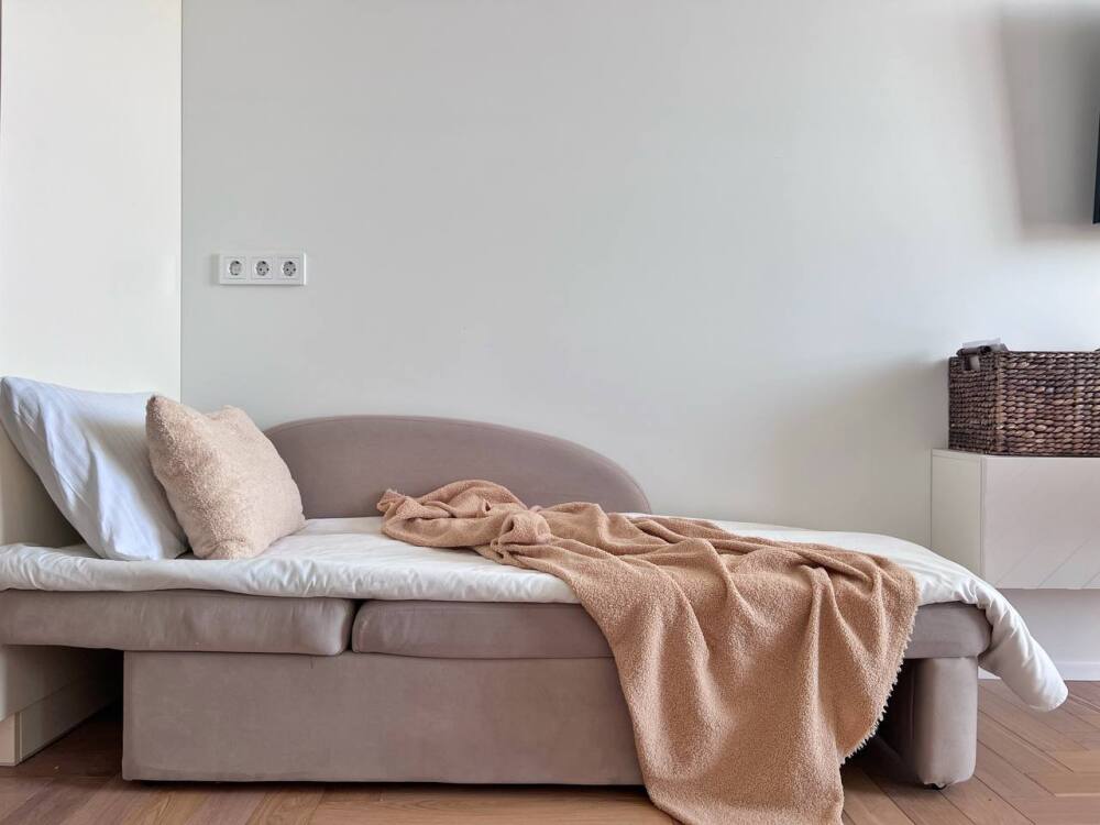 В зоне спальни для Вас будет подготовлена широкая кровать 160 на 200 с ортопедическим матрасом, а на окнах - шторы blackout для Вашего комфортного сна. Так же есть диван-кровать 180 на 70.