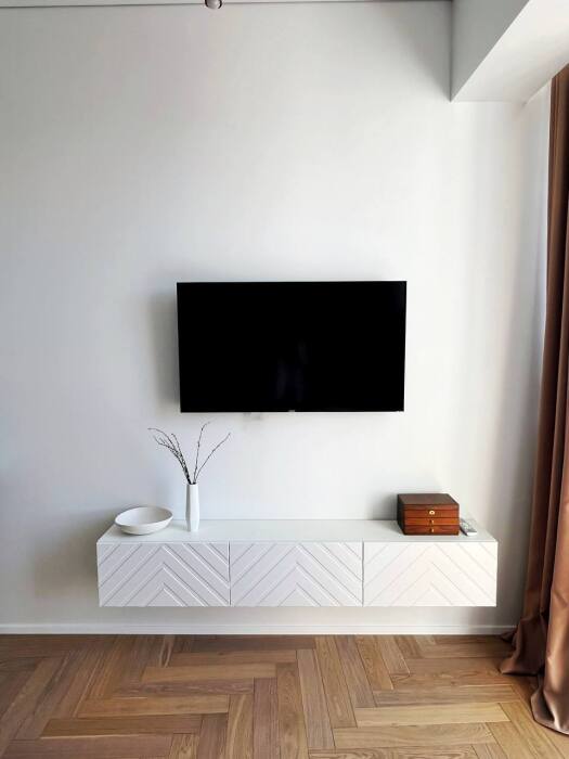 В зоне спальни установлен большой телевизор с функцией Smart-Tv и приложениями Wink, IVI, Okko. Вы сможете воспользоваться ими и посмотреть свои любимые фильмы и сериалы.